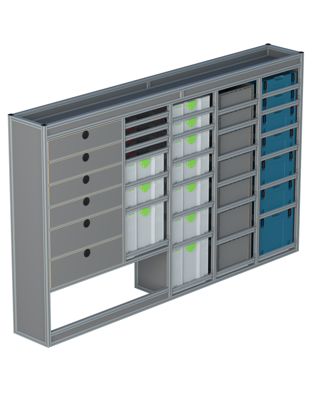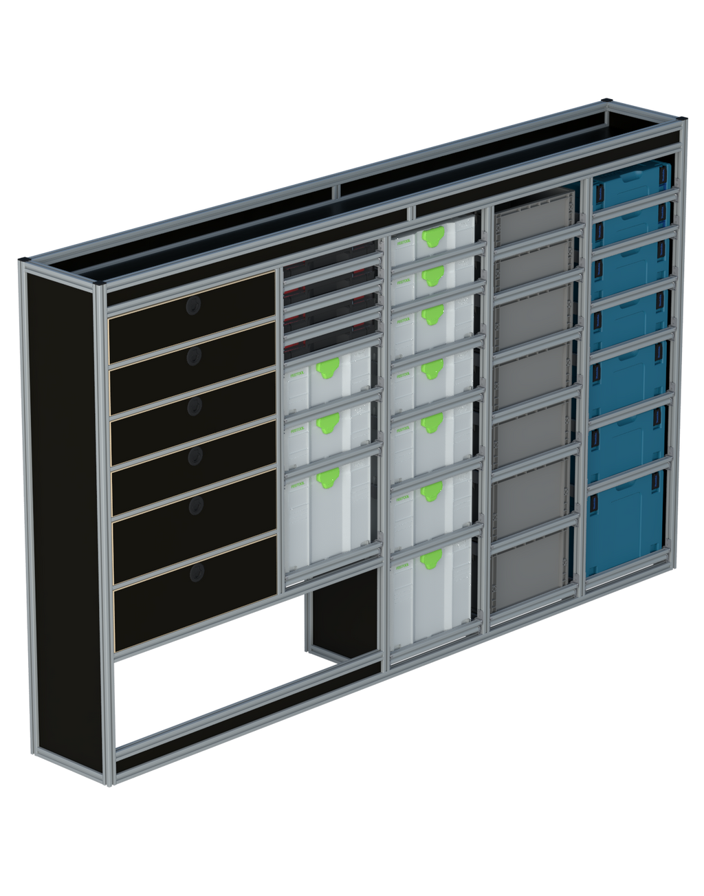 Alle lades zijn volledig traploos in hoogte verstelbaar en zijn later makkelijk weg te halen of bij te plaatsen. De lades zijn standaard voorzien van een goed doordachte ladevergrendeling om het open schuiven tijdens het rijden te voorkomen met een hoog gebruiksgemak.