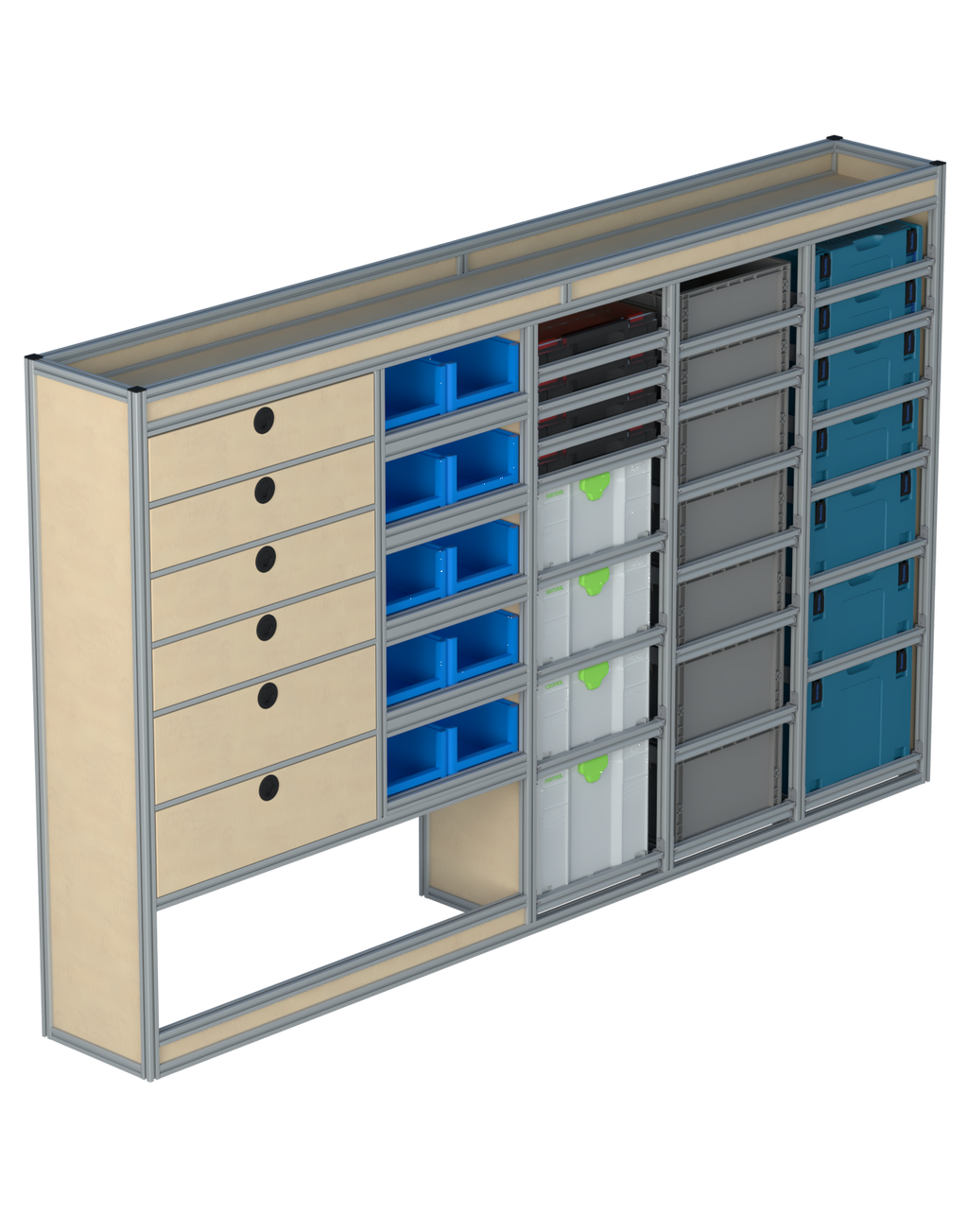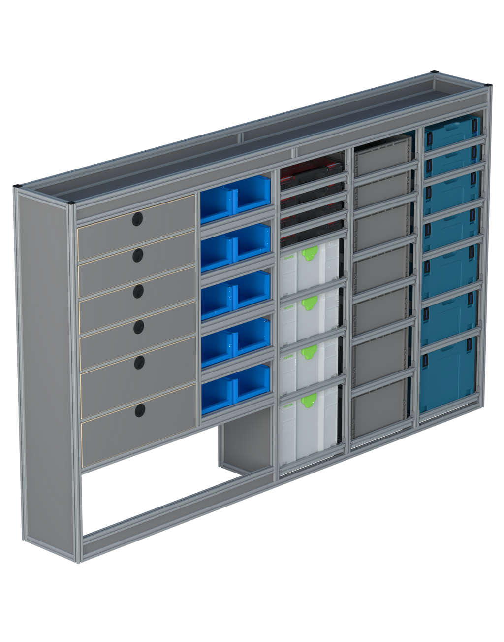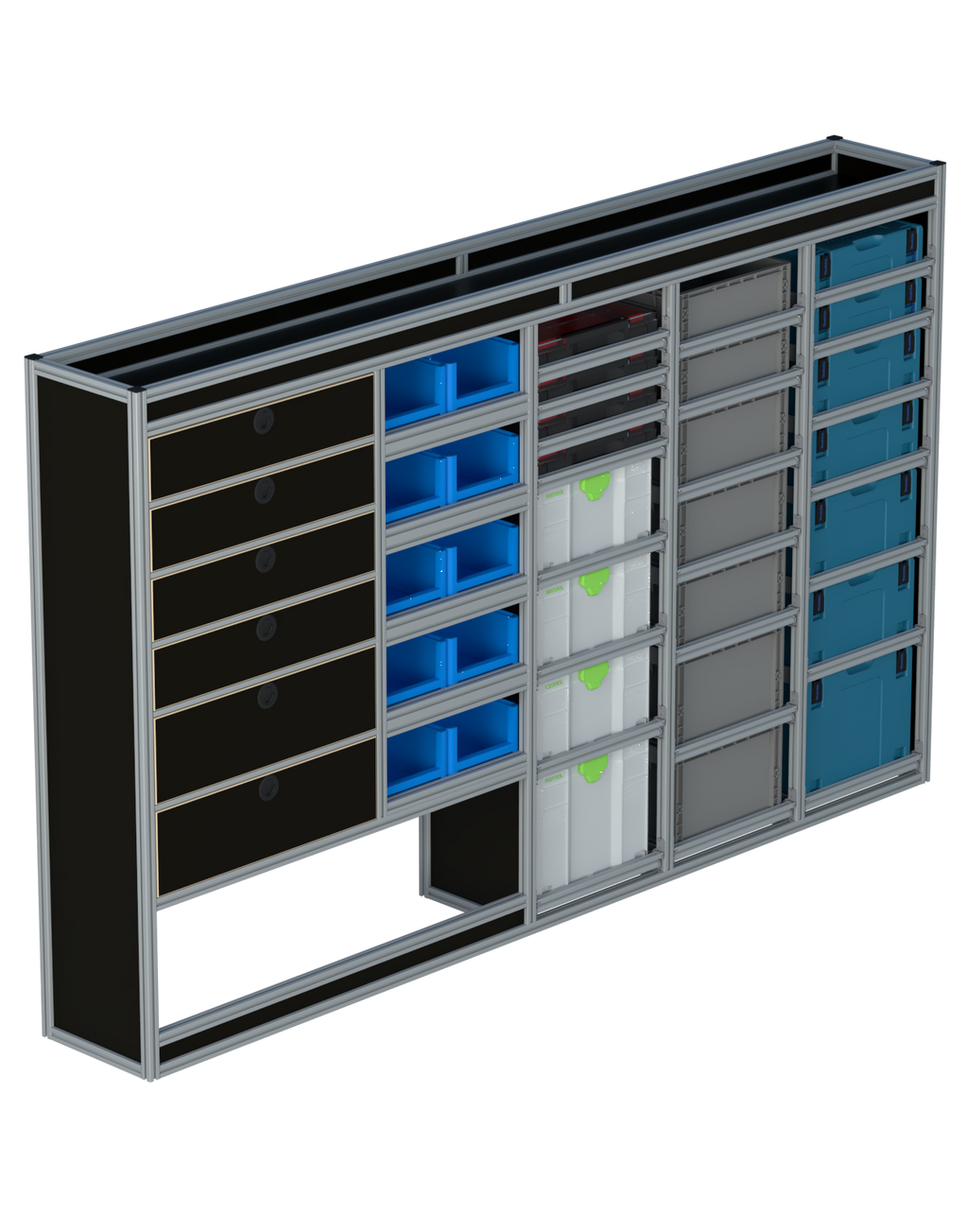 Alle lades zijn volledig traploos in hoogte verstelbaar en zijn later makkelijk weg te halen of bij te plaatsen. De lades zijn standaard voorzien van een goed doordachte ladevergrendeling om het open schuiven tijdens het rijden te voorkomen met een hoog gebruiksgemak.