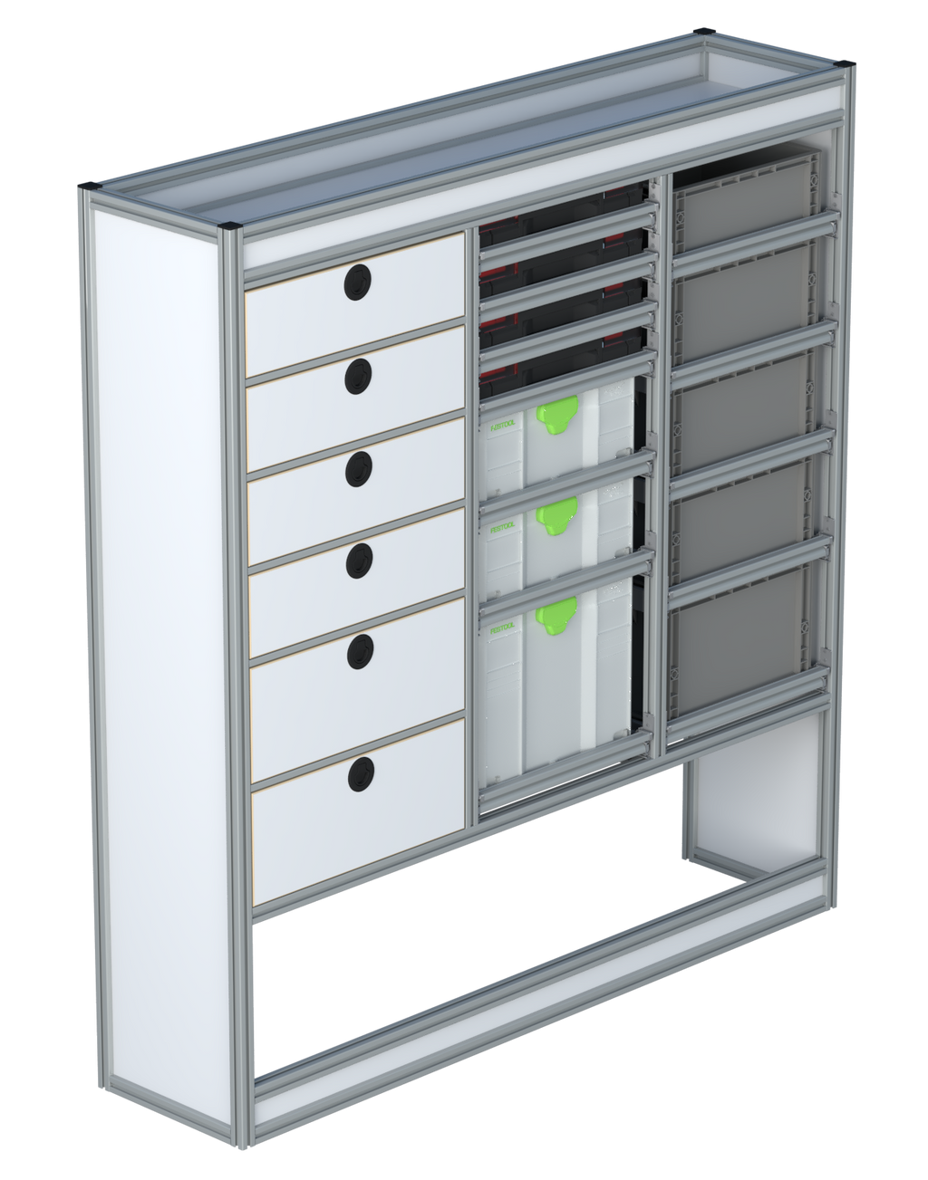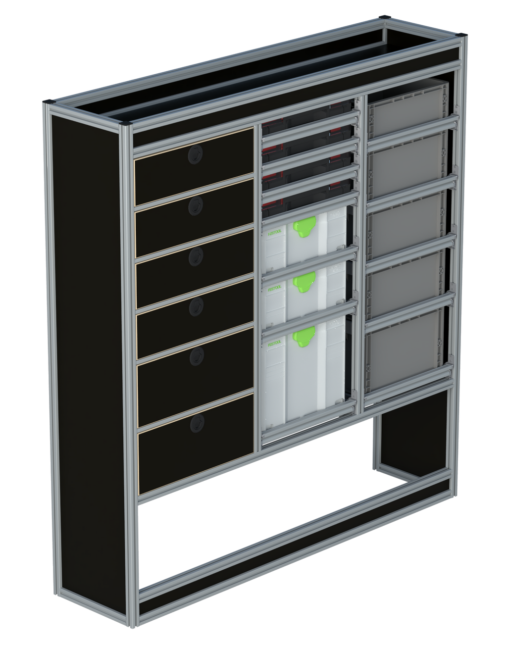 Alle lades zijn volledig traploos in hoogte verstelbaar en zijn later makkelijk weg te halen of bij te plaatsen. De lades zijn standaard voorzien van een goed doordachte ladevergrendeling om het open schuiven tijdens het rijden te voorkomen met een hoog gebruiksgemak.