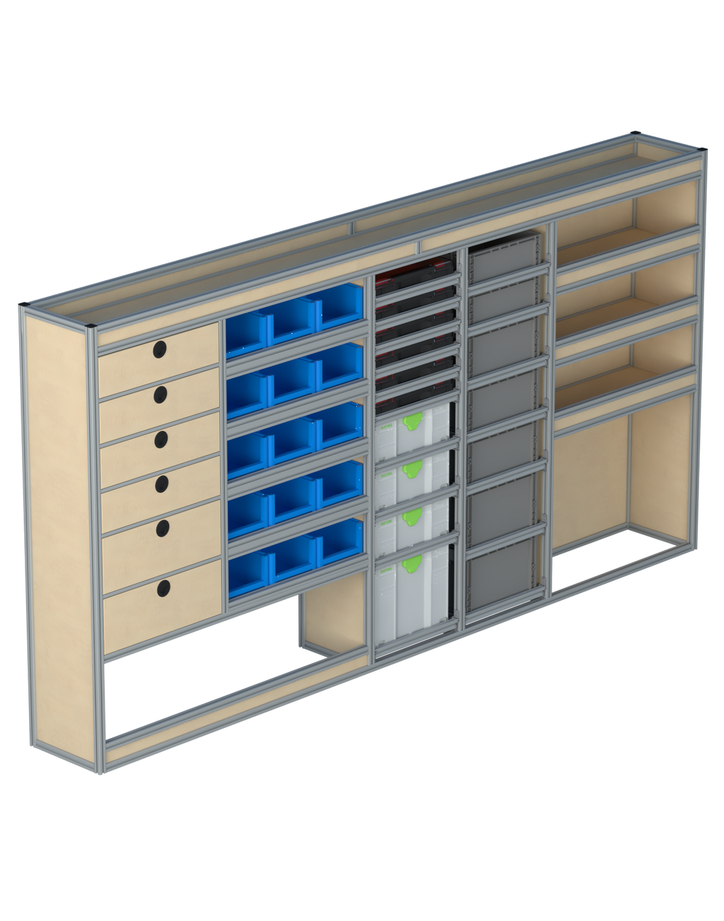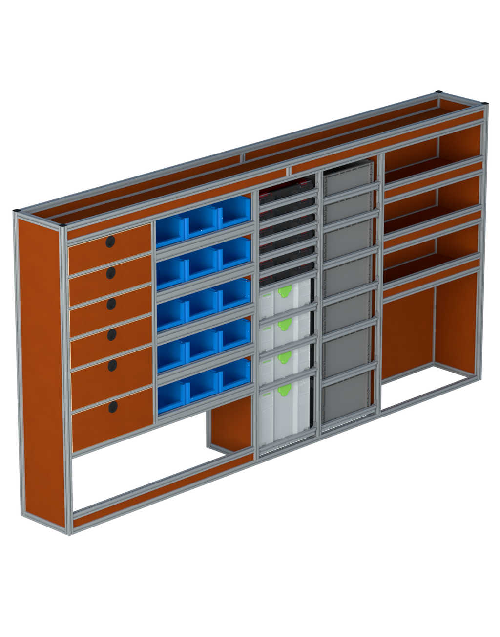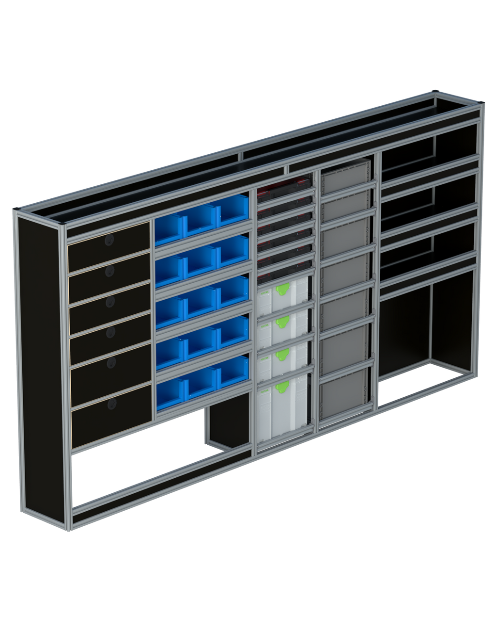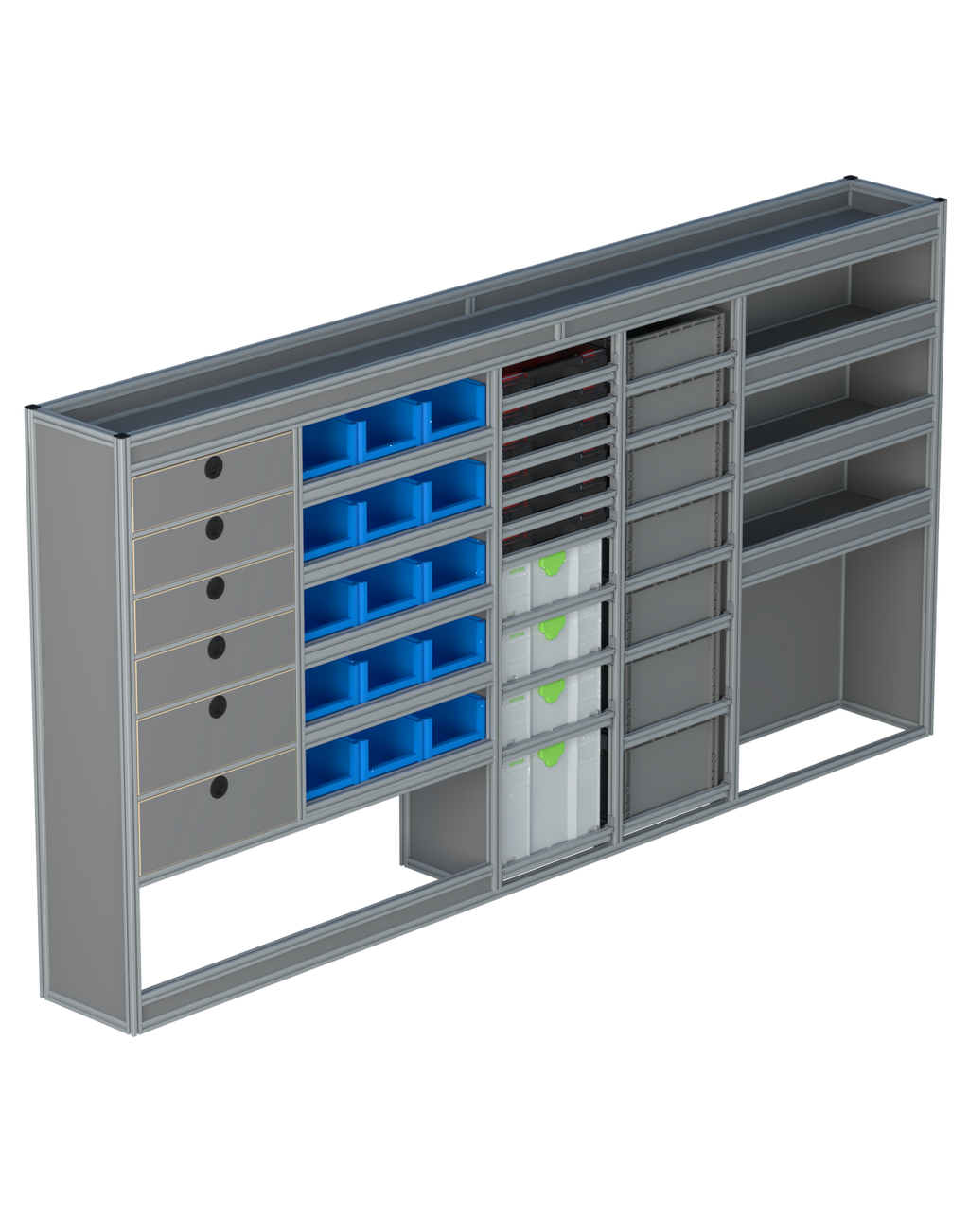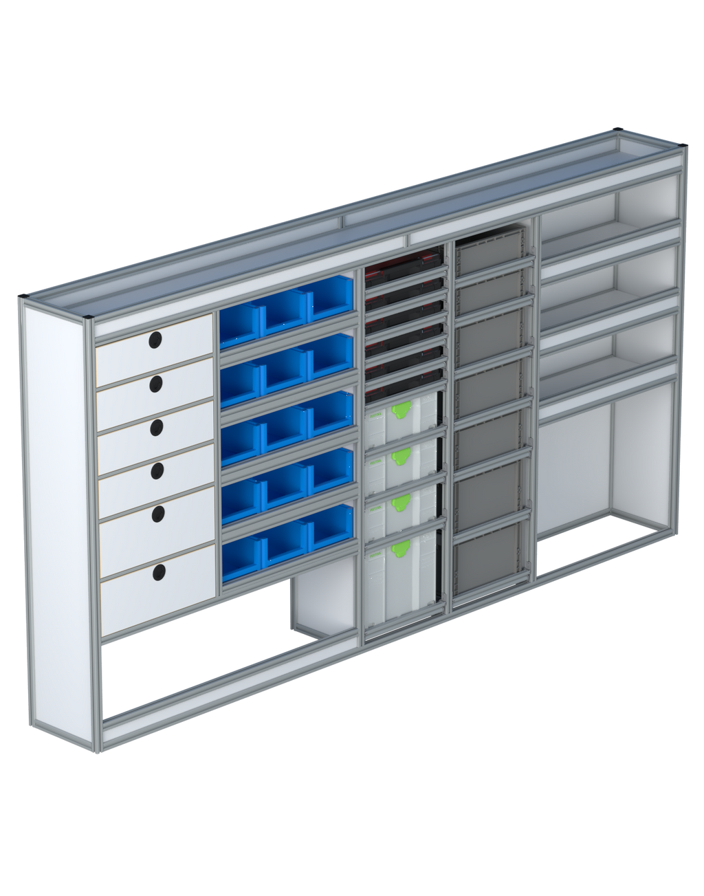 Alle lades zijn volledig traploos in hoogte verstelbaar en zijn later makkelijk weg te halen of bij te plaatsen. De lades zijn standaard voorzien van een goed doordachte ladevergrendeling om het open schuiven tijdens het rijden te voorkomen met een hoog gebruiksgemak.