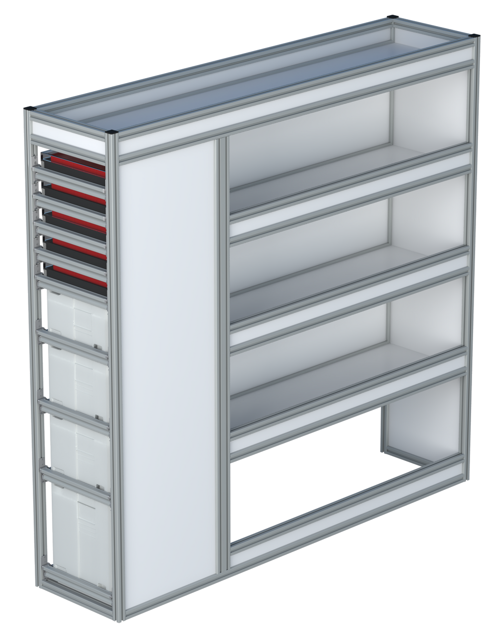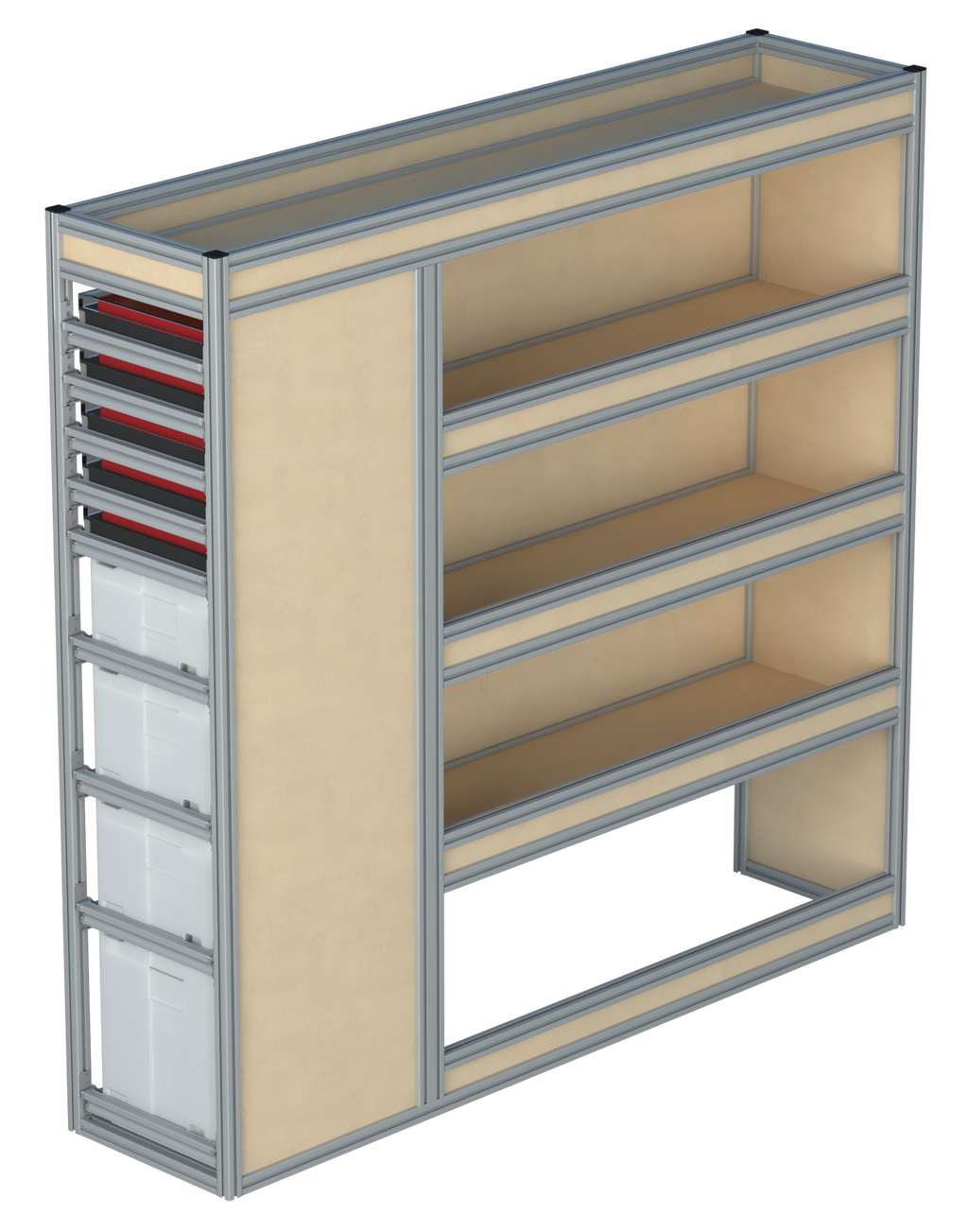 Alle lades zijn volledig traploos in hoogte verstelbaar en zijn later makkelijk weg te halen of bij te plaatsen. De lades zijn standaard voorzien van een goed doordachte ladevergrendeling om het open schuiven tijdens het rijden te voorkomen met een hoog gebruiksgemak.