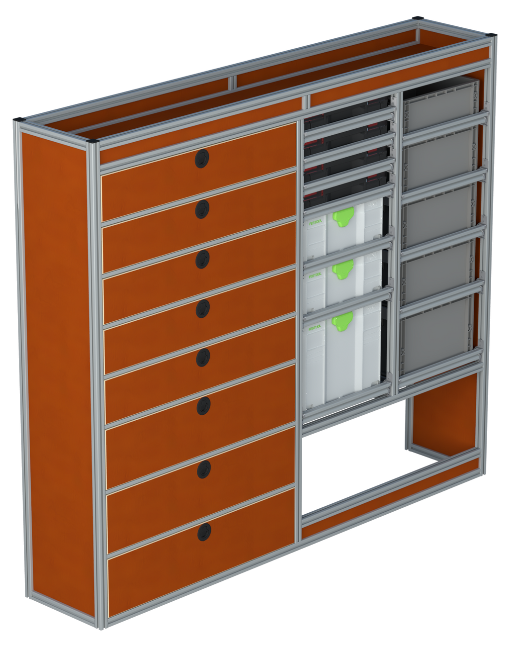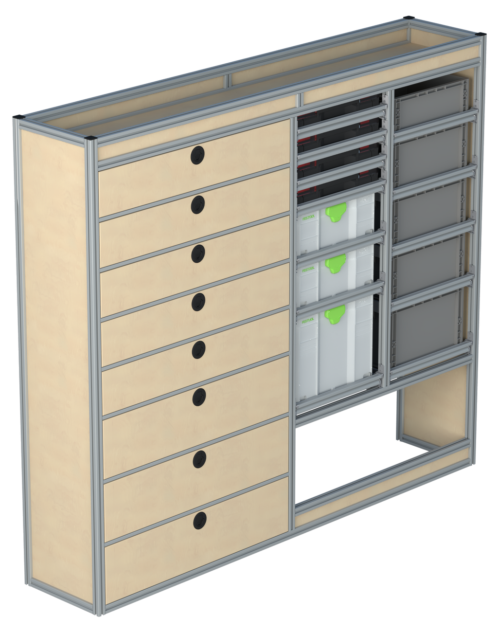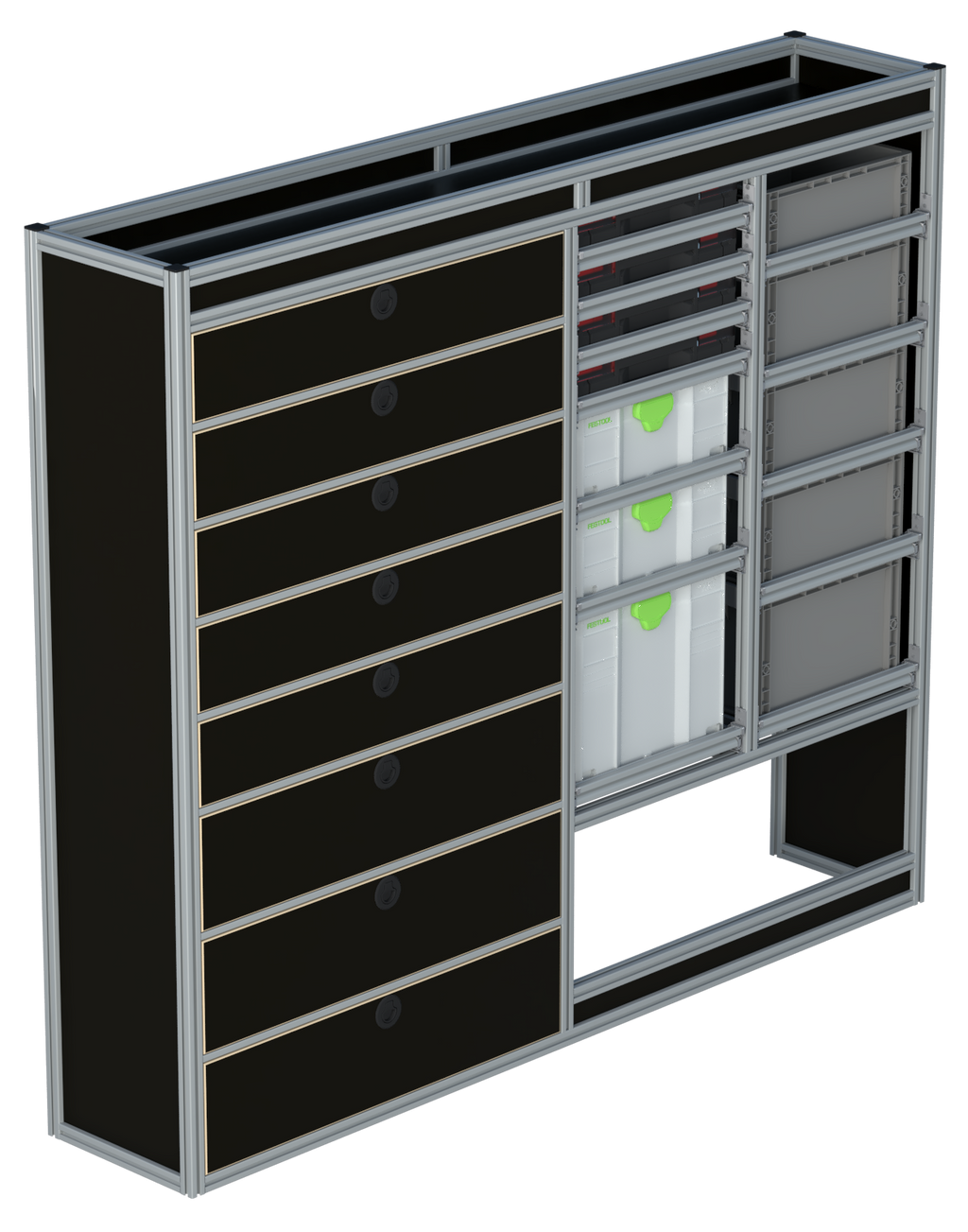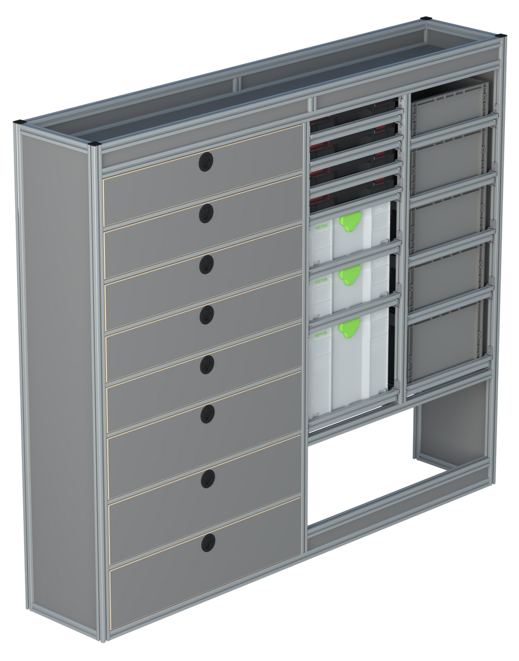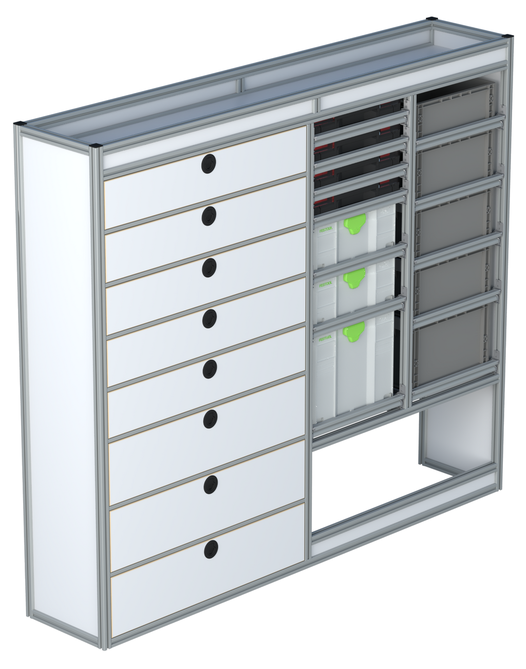Alle lades zijn volledig traploos in hoogte verstelbaar en zijn later makkelijk weg te halen of bij te plaatsen. De lades zijn standaard voorzien van een goed doordachte ladevergrendeling om het open schuiven tijdens het rijden te voorkomen met een hoog gebruiksgemak.