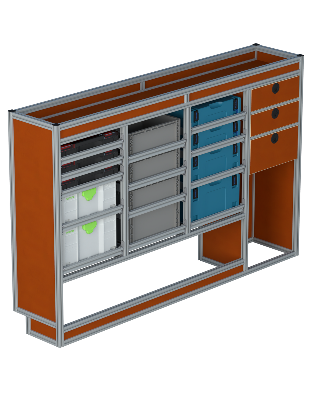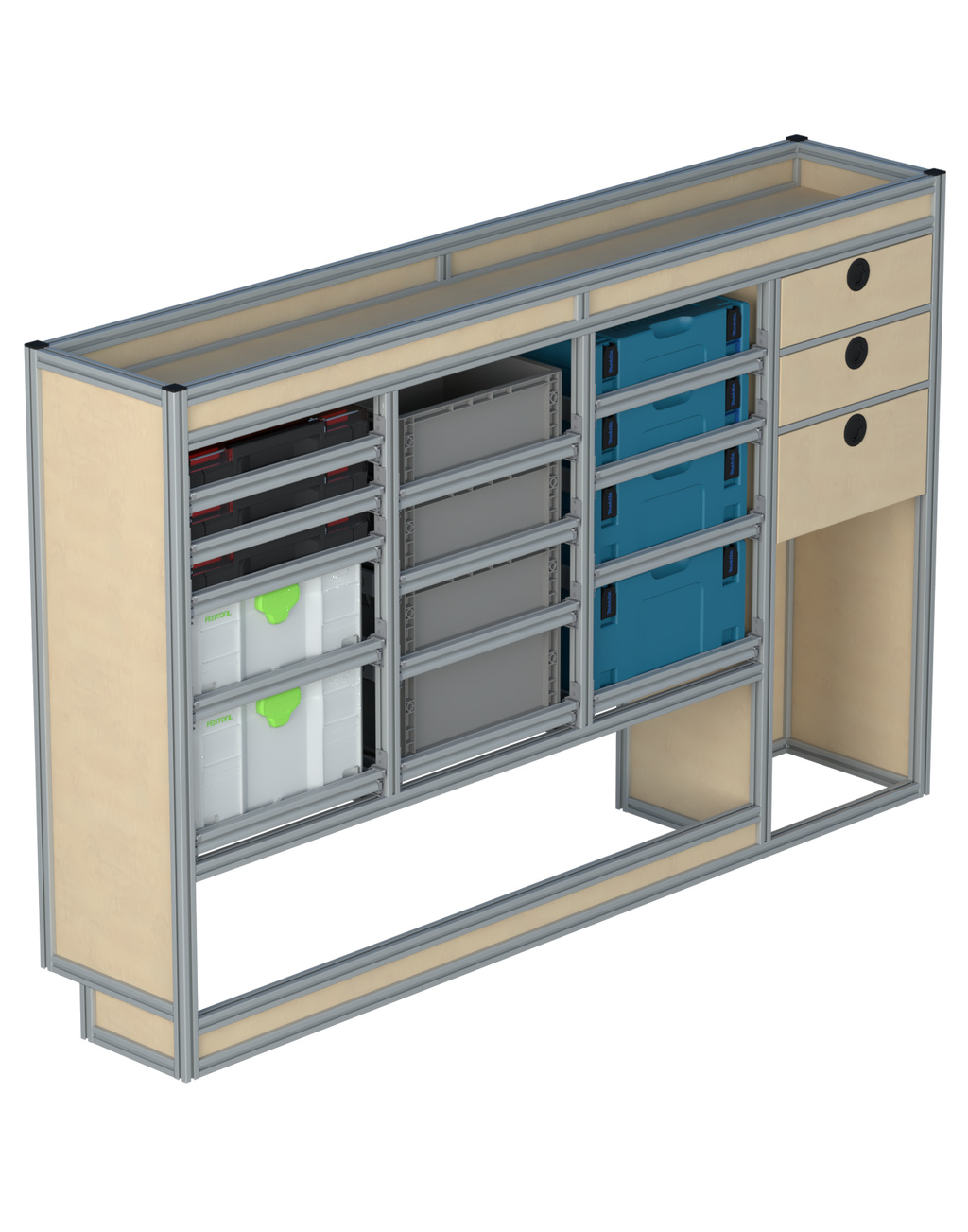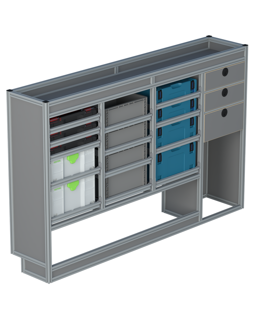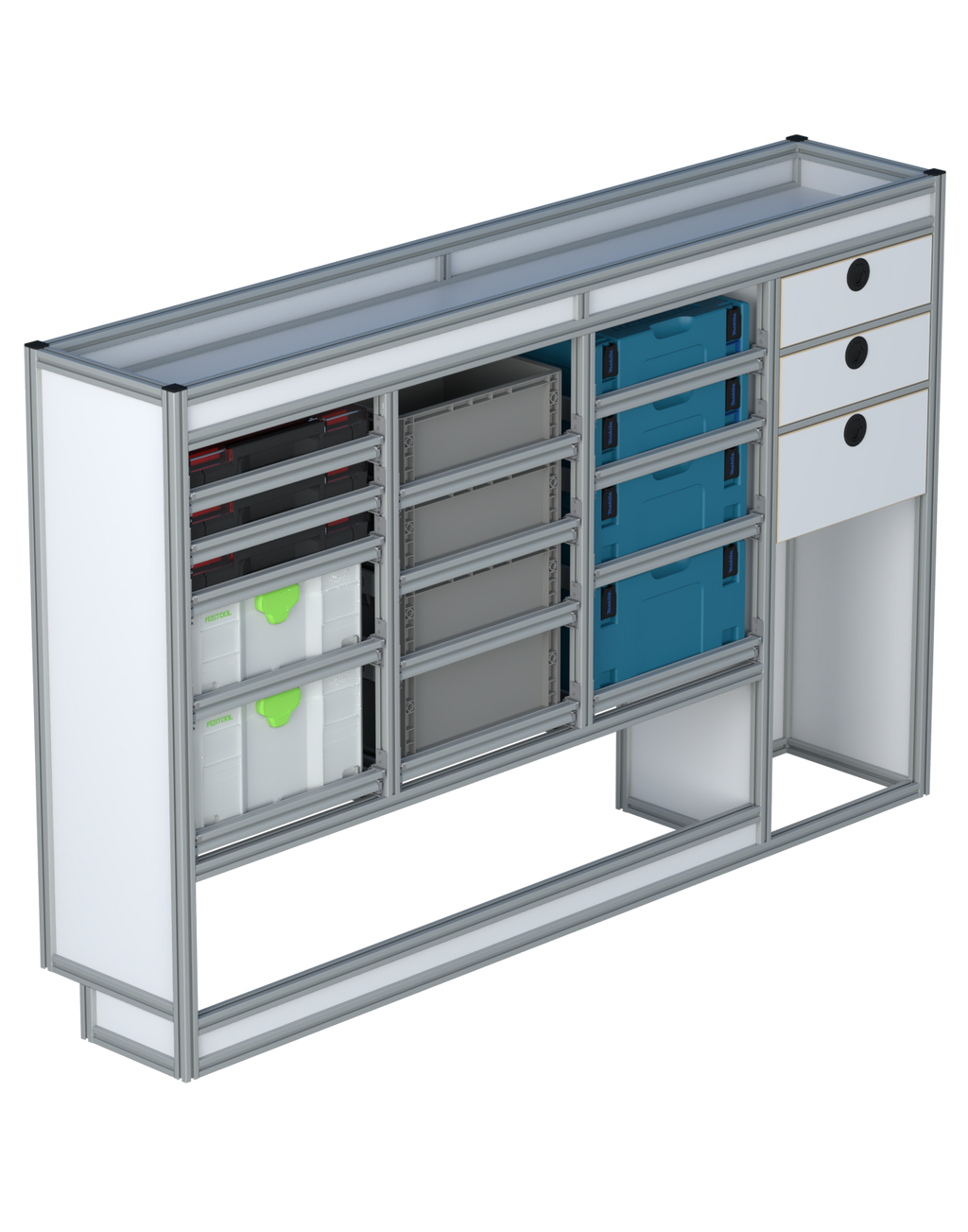 Alle lades zijn volledig traploos in hoogte verstelbaar en zijn later makkelijk weg te halen of bij te plaatsen. De lades zijn standaard voorzien van een goed doordachte ladevergrendeling om het open schuiven tijdens het rijden te voorkomen met een hoog gebruiksgemak.