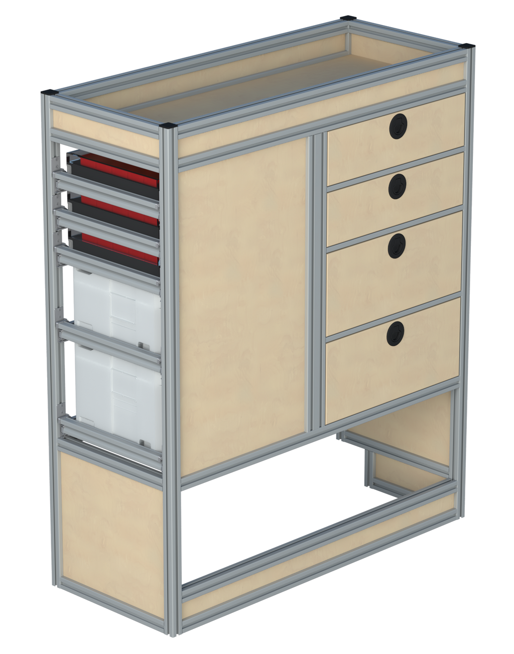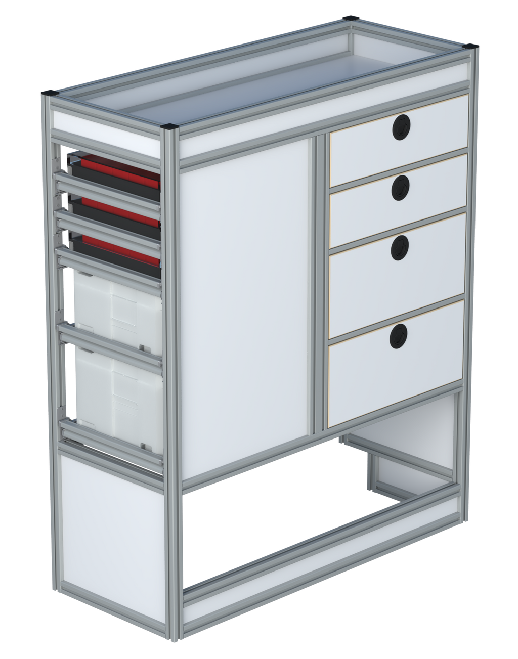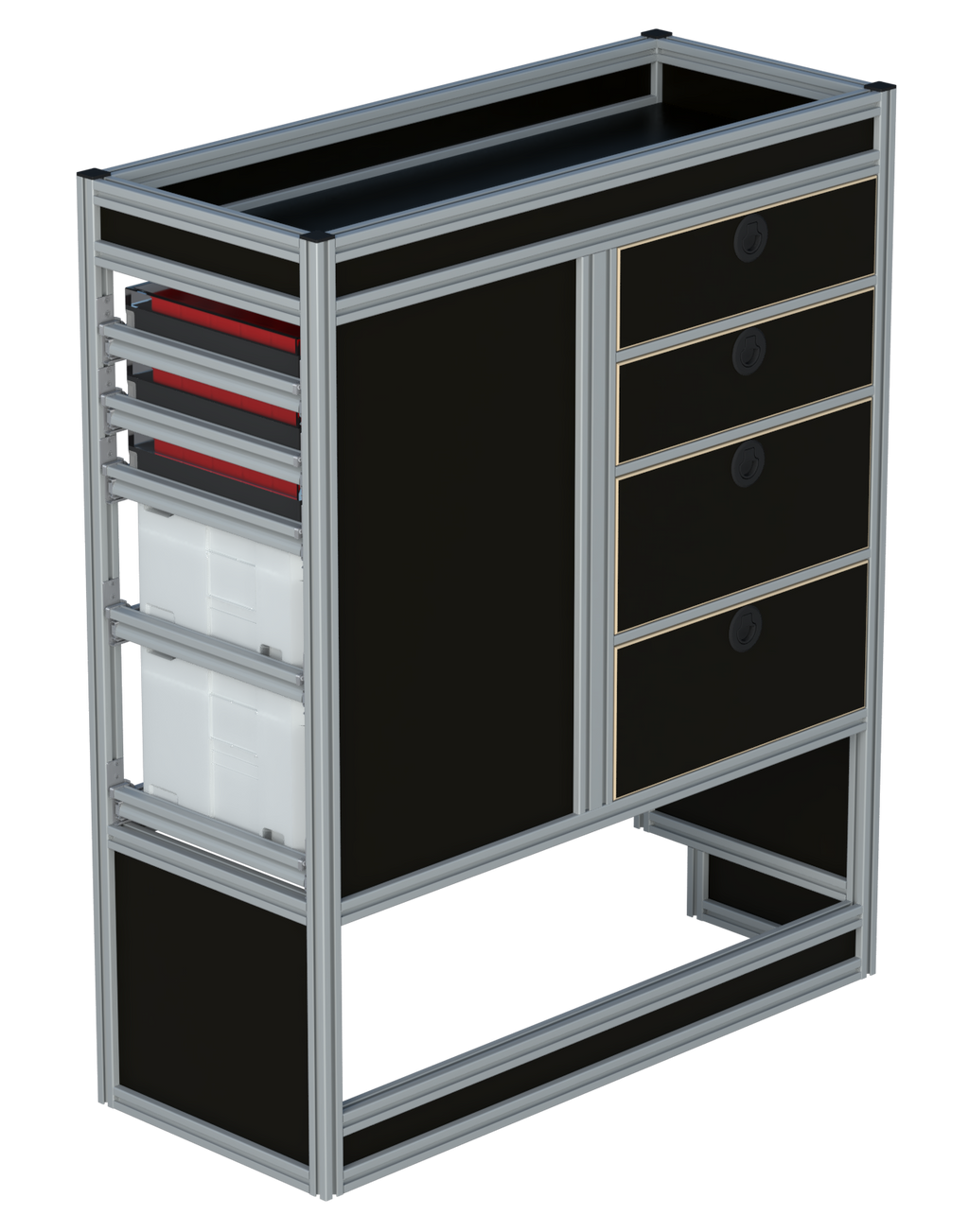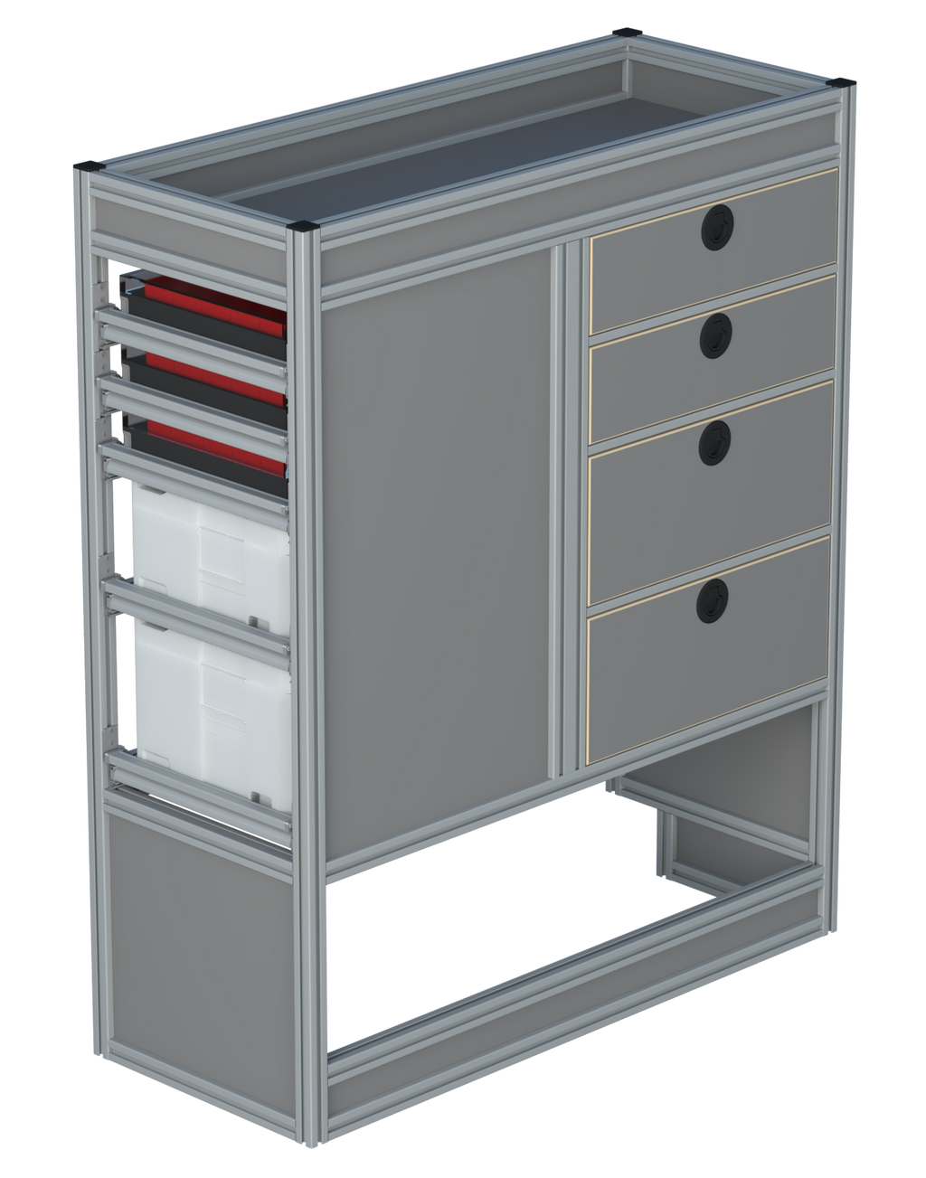 Alle lades zijn volledig traploos in hoogte verstelbaar en zijn later makkelijk weg te halen of bij te plaatsen. De lades zijn standaard voorzien van een goed doordachte ladevergrendeling om het open schuiven tijdens het rijden te voorkomen met een hoog gebruiksgemak.