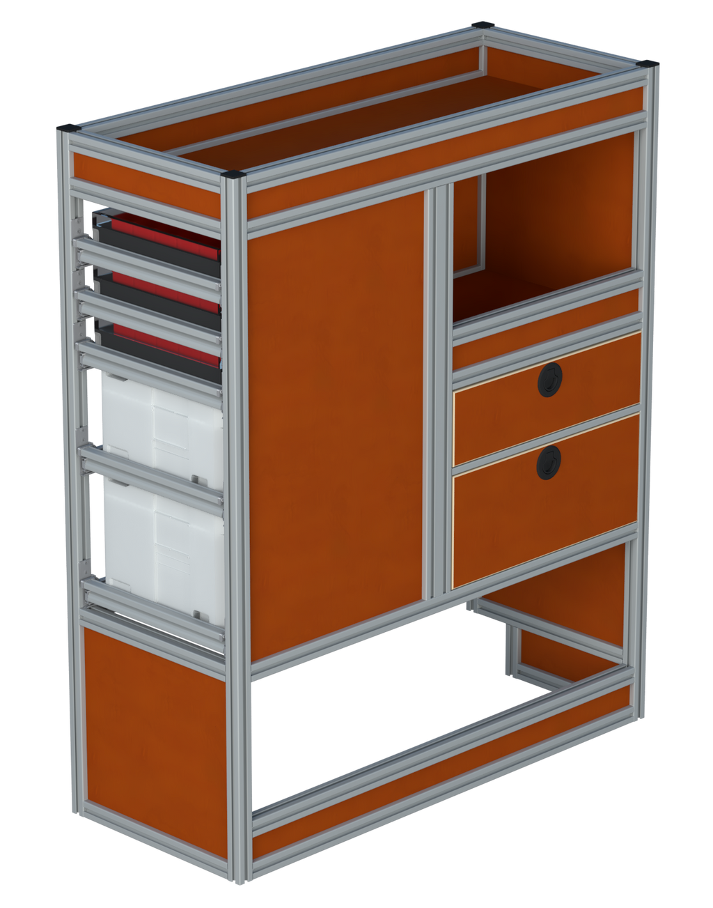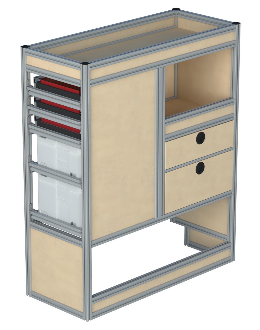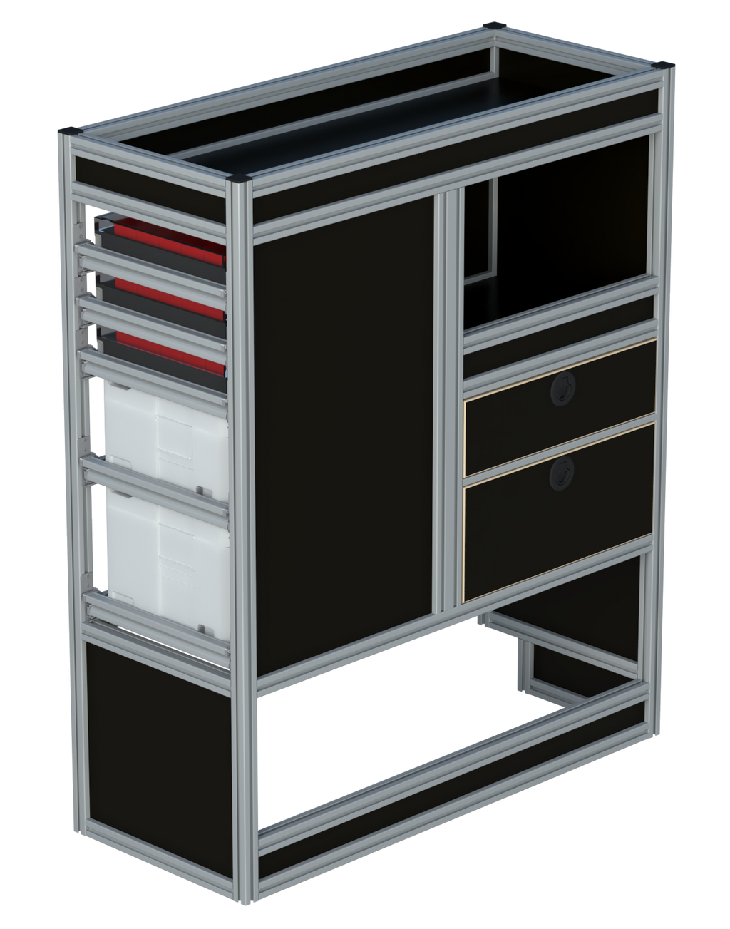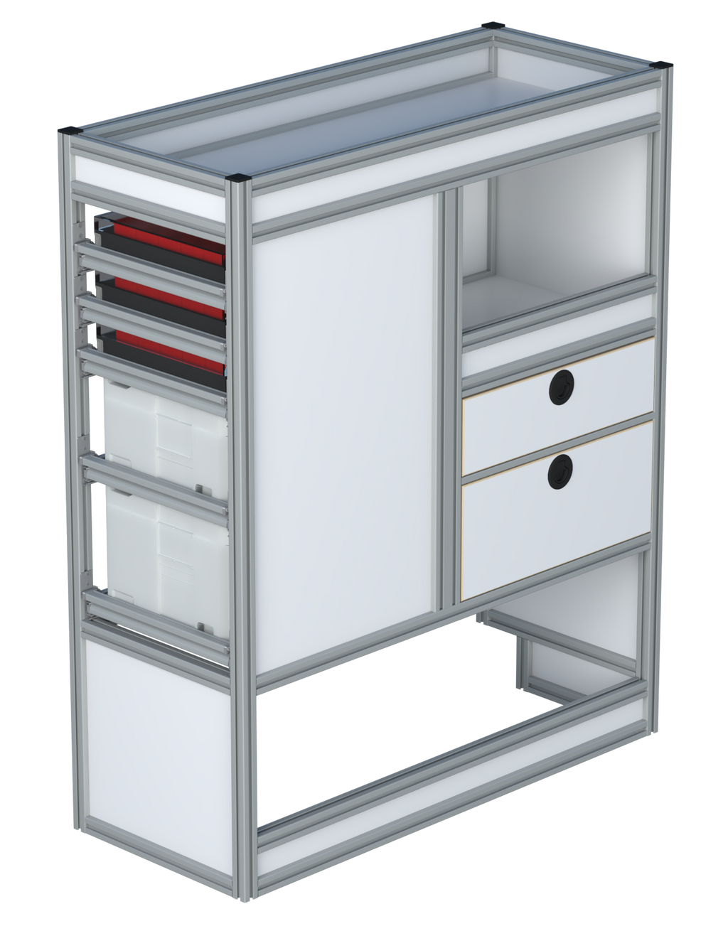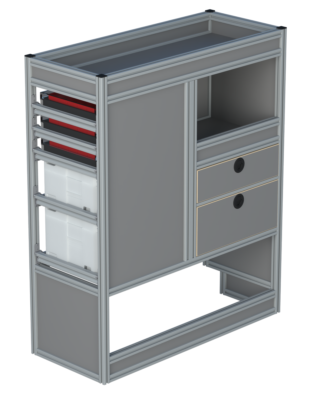 Alle lades zijn volledig traploos in hoogte verstelbaar en zijn later makkelijk weg te halen of bij te plaatsen. De lades zijn standaard voorzien van een goed doordachte ladevergrendeling om het open schuiven tijdens het rijden te voorkomen met een hoog gebruiksgemak.