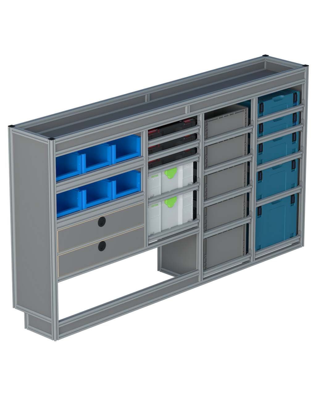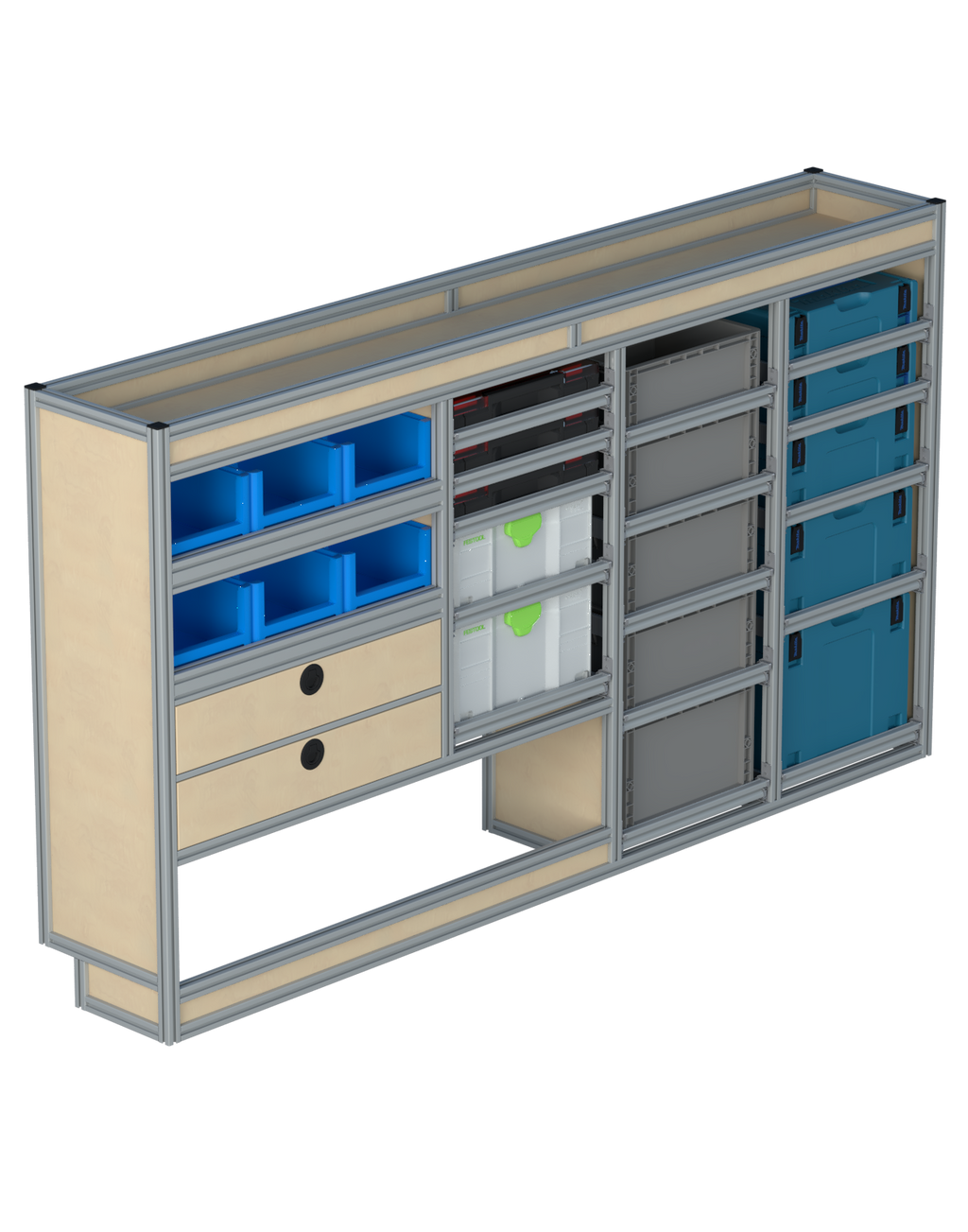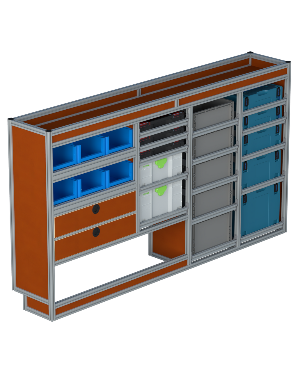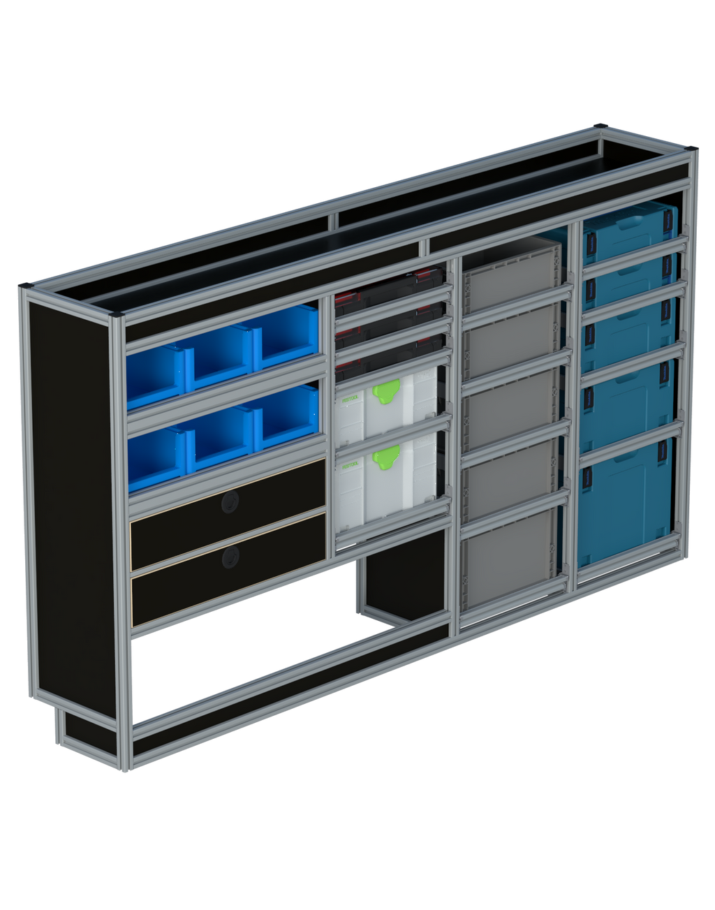 Alle lades zijn volledig traploos in hoogte verstelbaar en zijn later makkelijk weg te halen of bij te plaatsen. De lades zijn standaard voorzien van een goed doordachte ladevergrendeling om het open schuiven tijdens het rijden te voorkomen met een hoog gebruiksgemak.