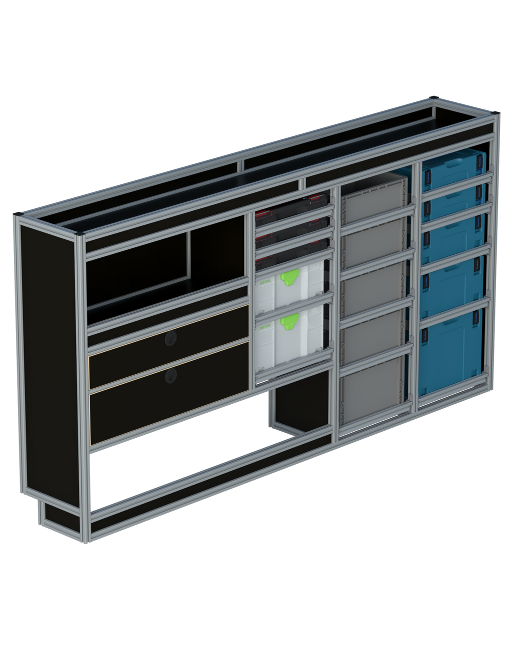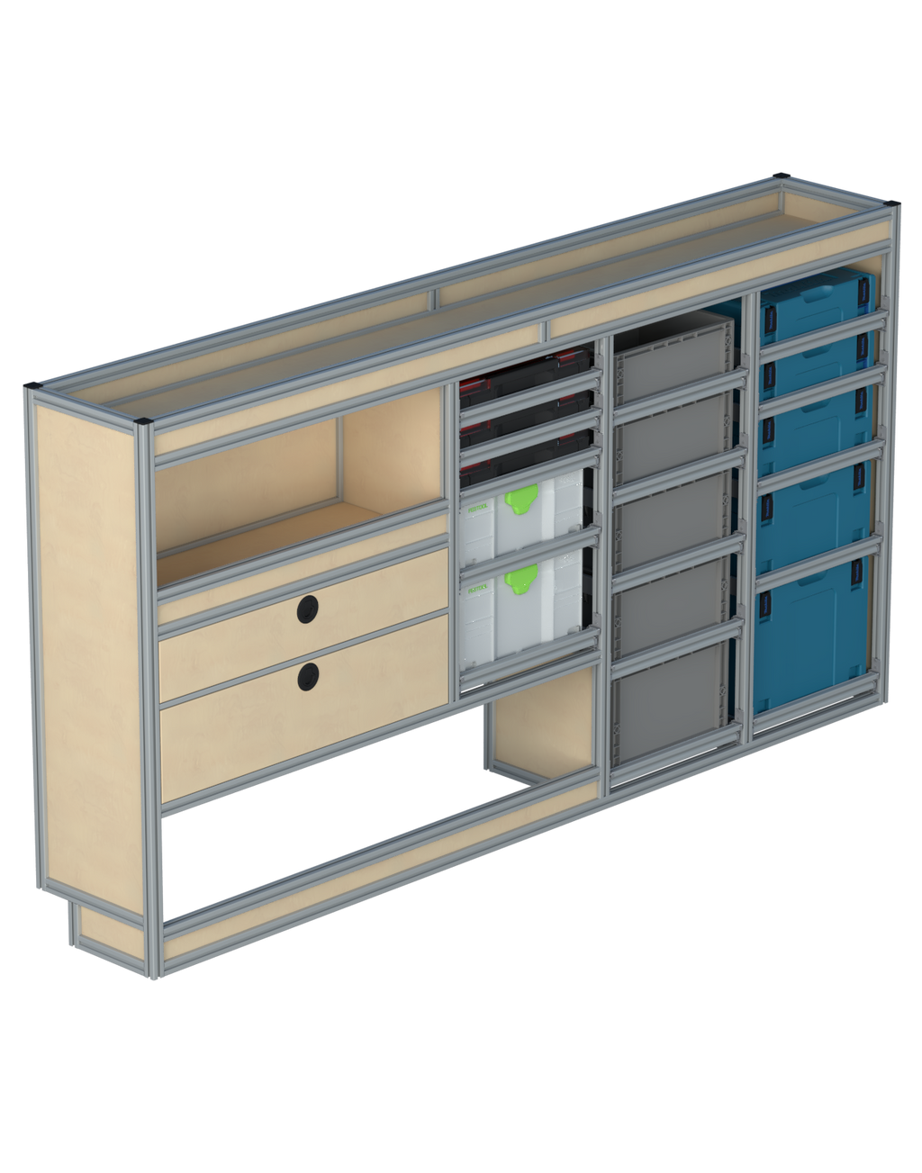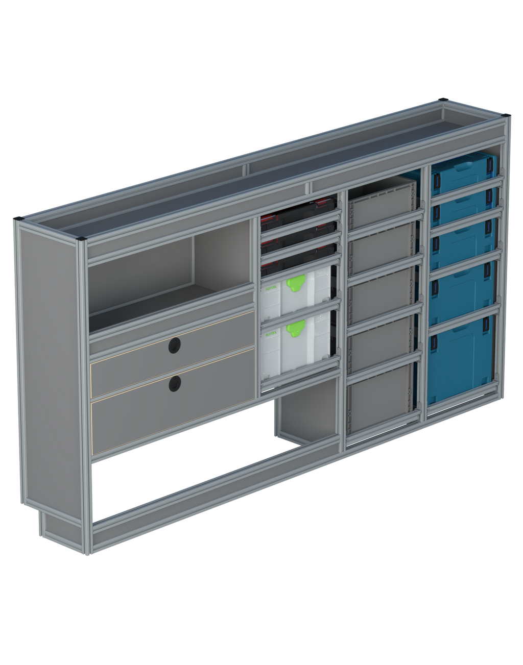 Alle lades zijn volledig traploos in hoogte verstelbaar en zijn later makkelijk weg te halen of bij te plaatsen. De lades zijn standaard voorzien van een goed doordachte ladevergrendeling om het open schuiven tijdens het rijden te voorkomen met een hoog gebruiksgemak.