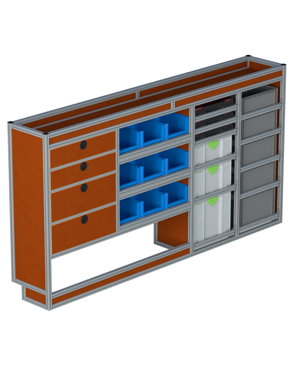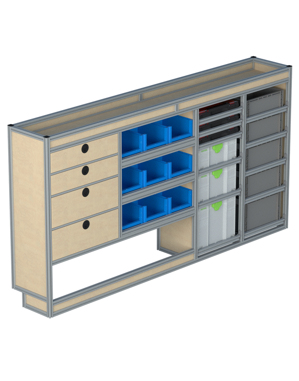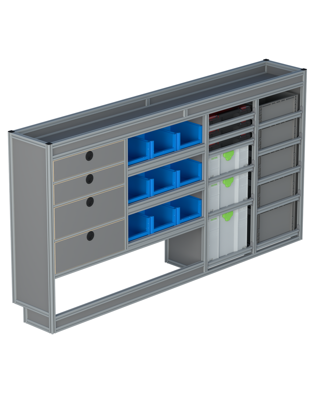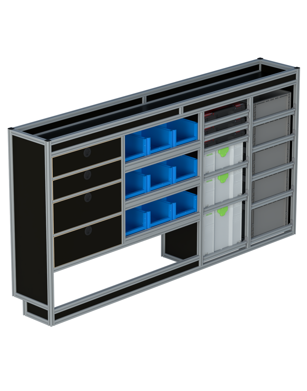 Alle lades zijn volledig traploos in hoogte verstelbaar en zijn later makkelijk weg te halen of bij te plaatsen. De lades zijn standaard voorzien van een goed doordachte ladevergrendeling om het open schuiven tijdens het rijden te voorkomen met een hoog gebruiksgemak.