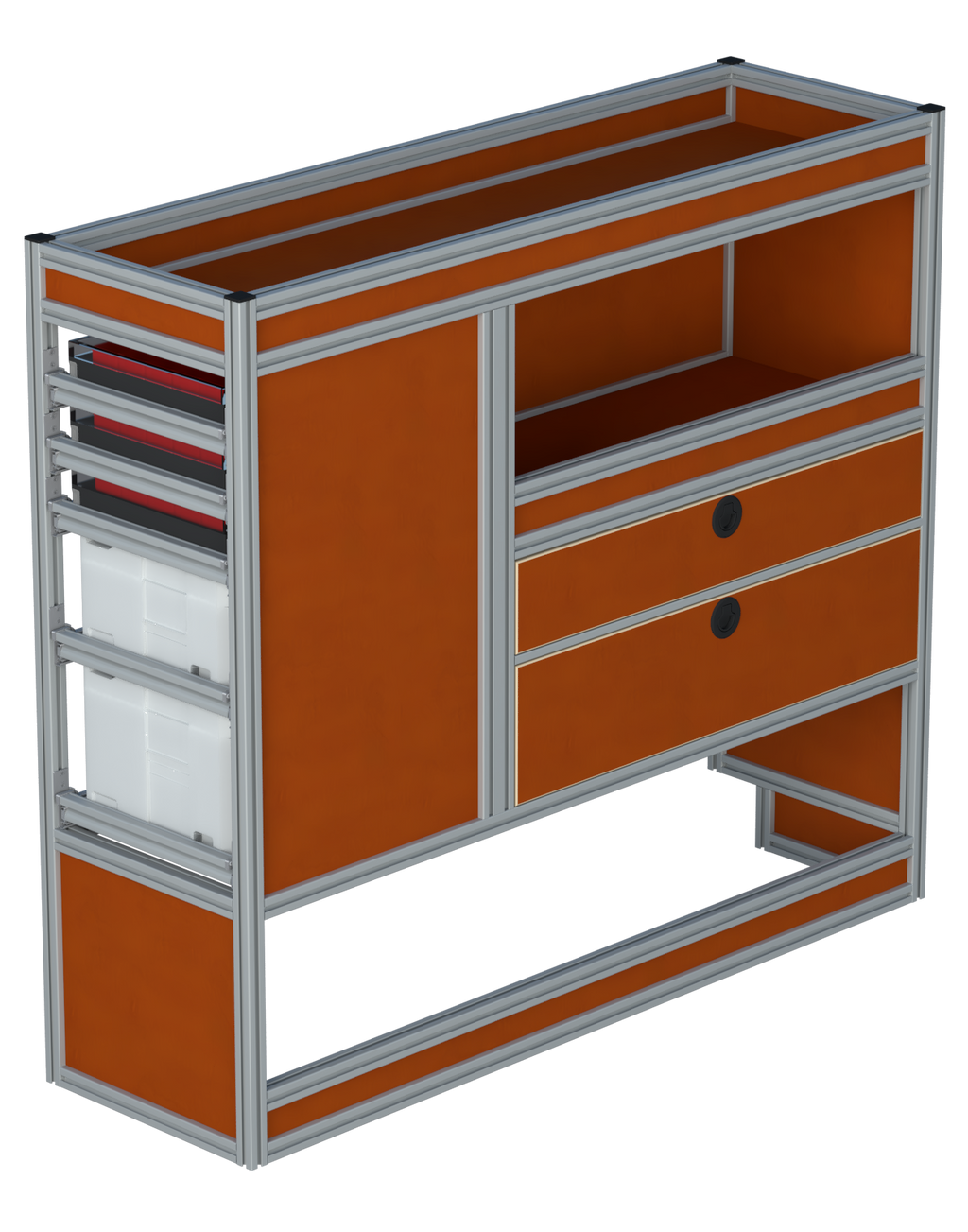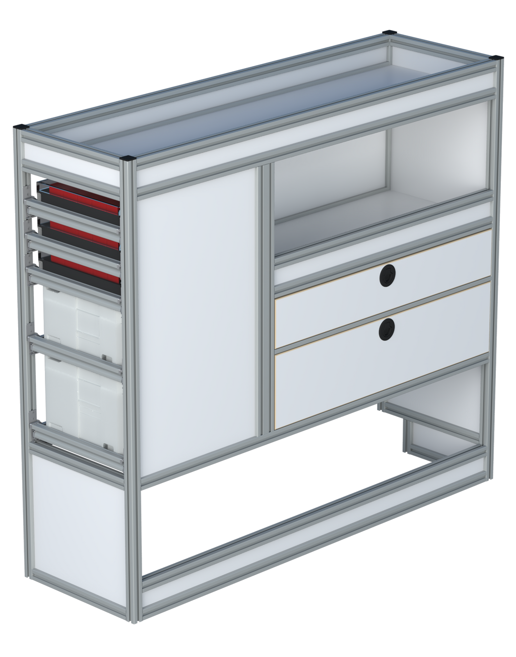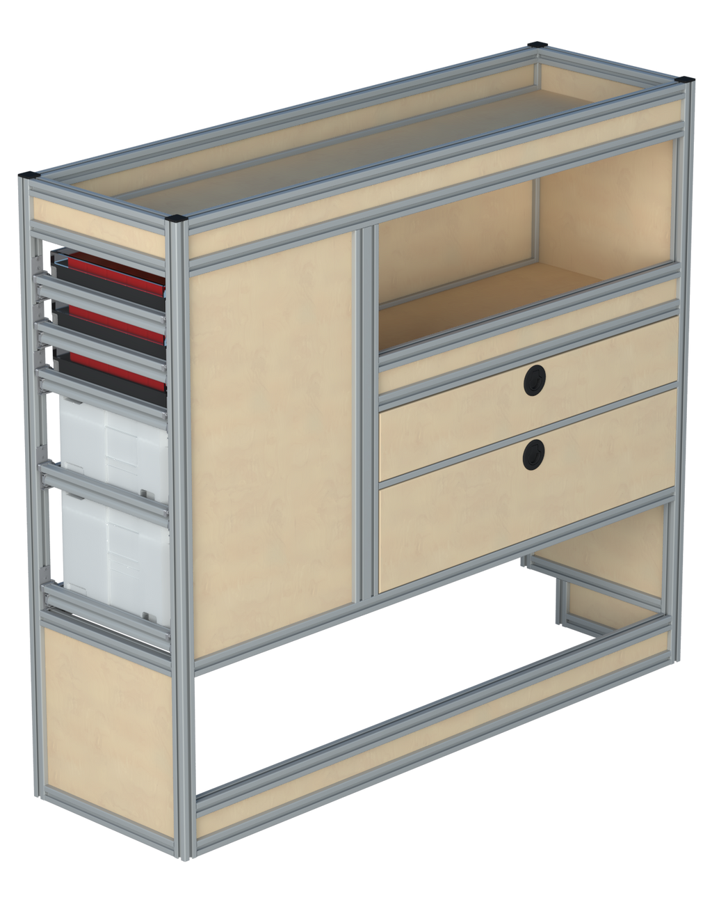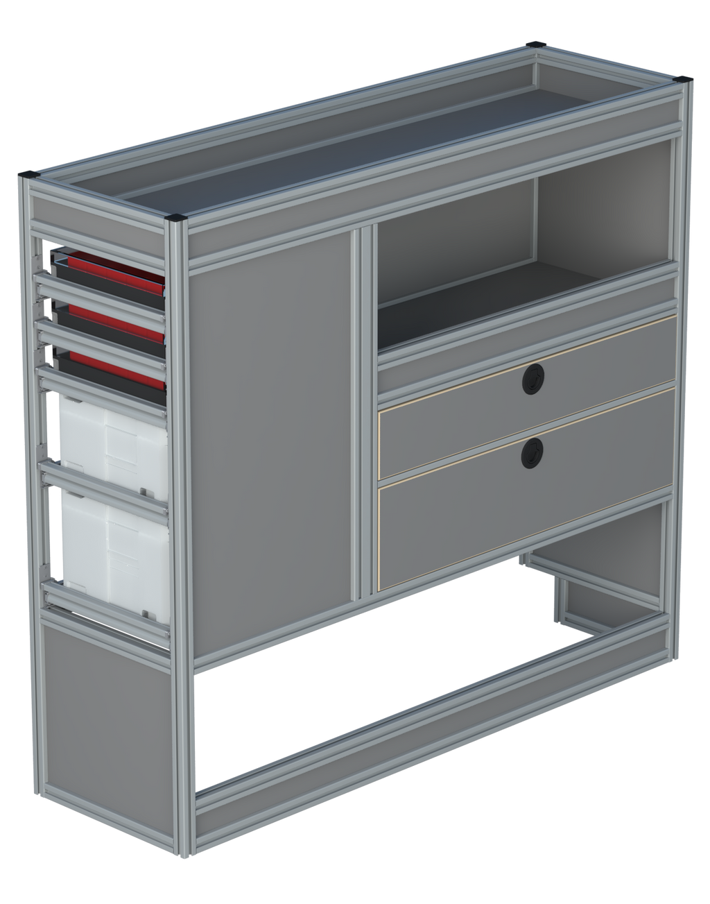 Alle lades zijn volledig traploos in hoogte verstelbaar en zijn later makkelijk weg te halen of bij te plaatsen. De lades zijn standaard voorzien van een goed doordachte ladevergrendeling om het open schuiven tijdens het rijden te voorkomen met een hoog gebruiksgemak.