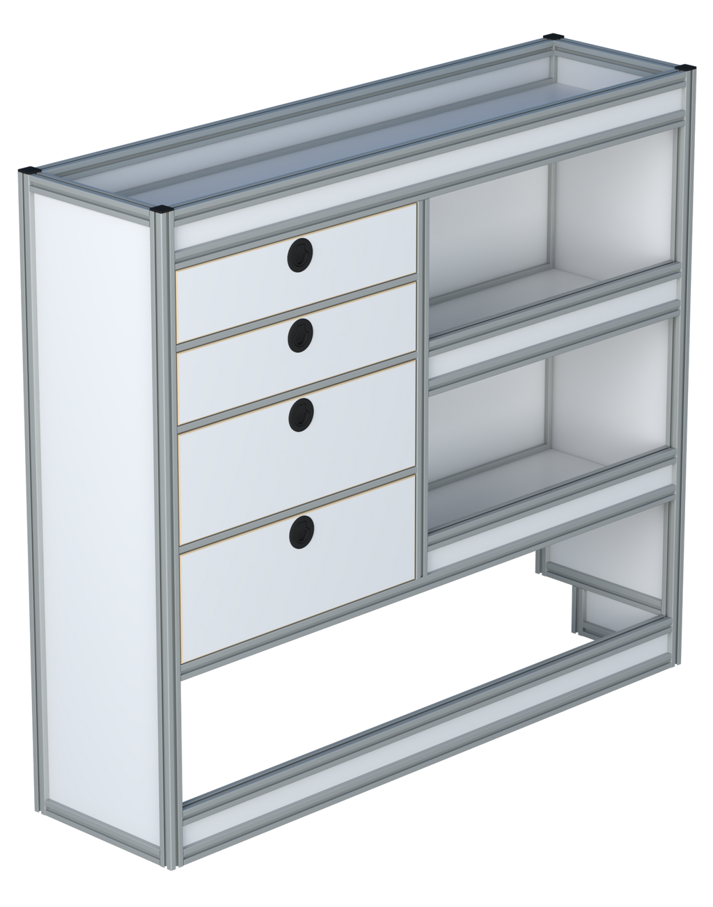 Een universeler systeem wat nog flexibeler in te zetten is dan je van ons al gewend was! Met een stevige aluminium handgreep trek je de lade eenvoudig volledig uit om jouw materialen te pakken of je koffer mee te nemen.