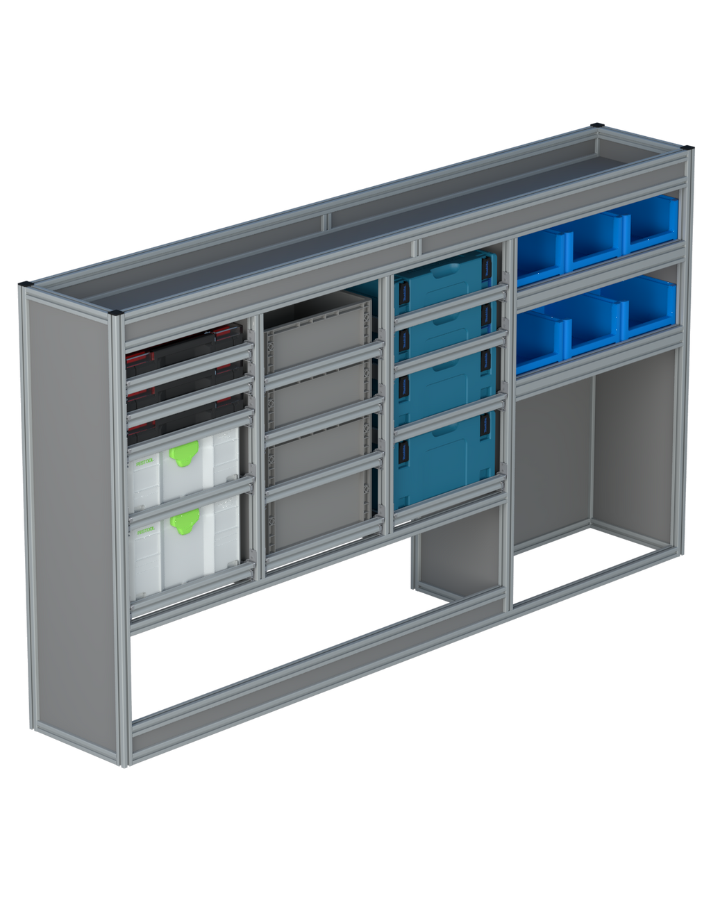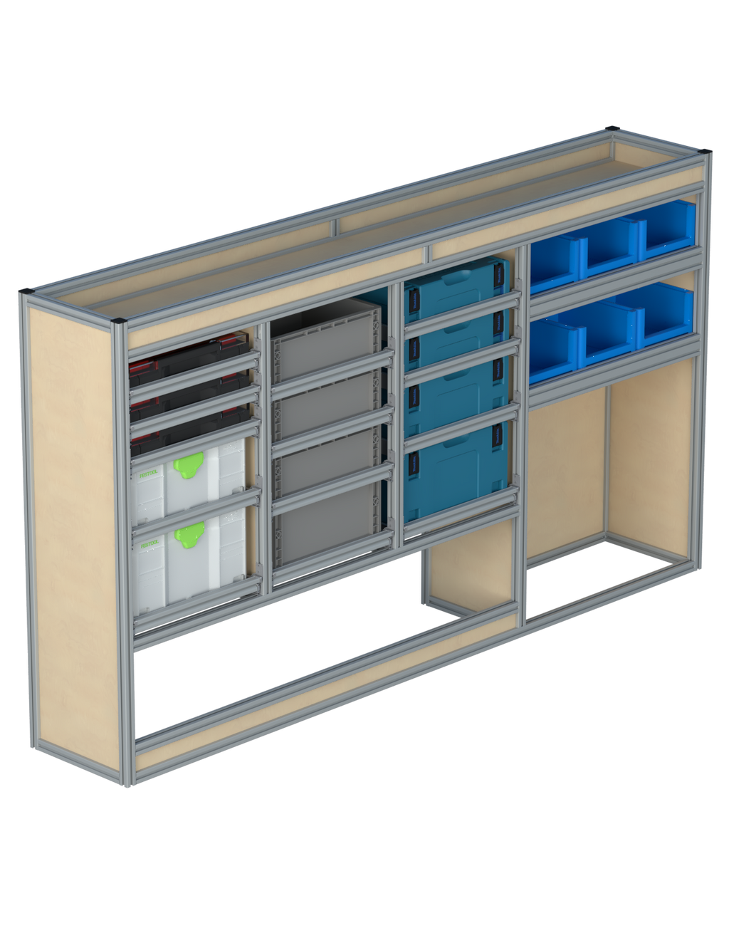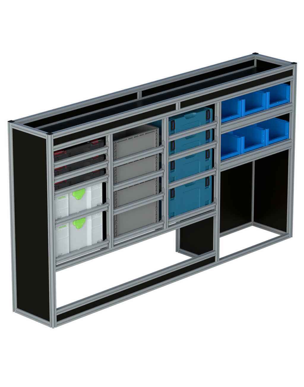 Alle lades zijn volledig traploos in hoogte verstelbaar en zijn later makkelijk weg te halen of bij te plaatsen. De lades zijn standaard voorzien van een goed doordachte ladevergrendeling om het open schuiven tijdens het rijden te voorkomen met een hoog gebruiksgemak.