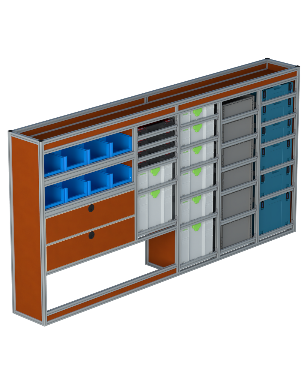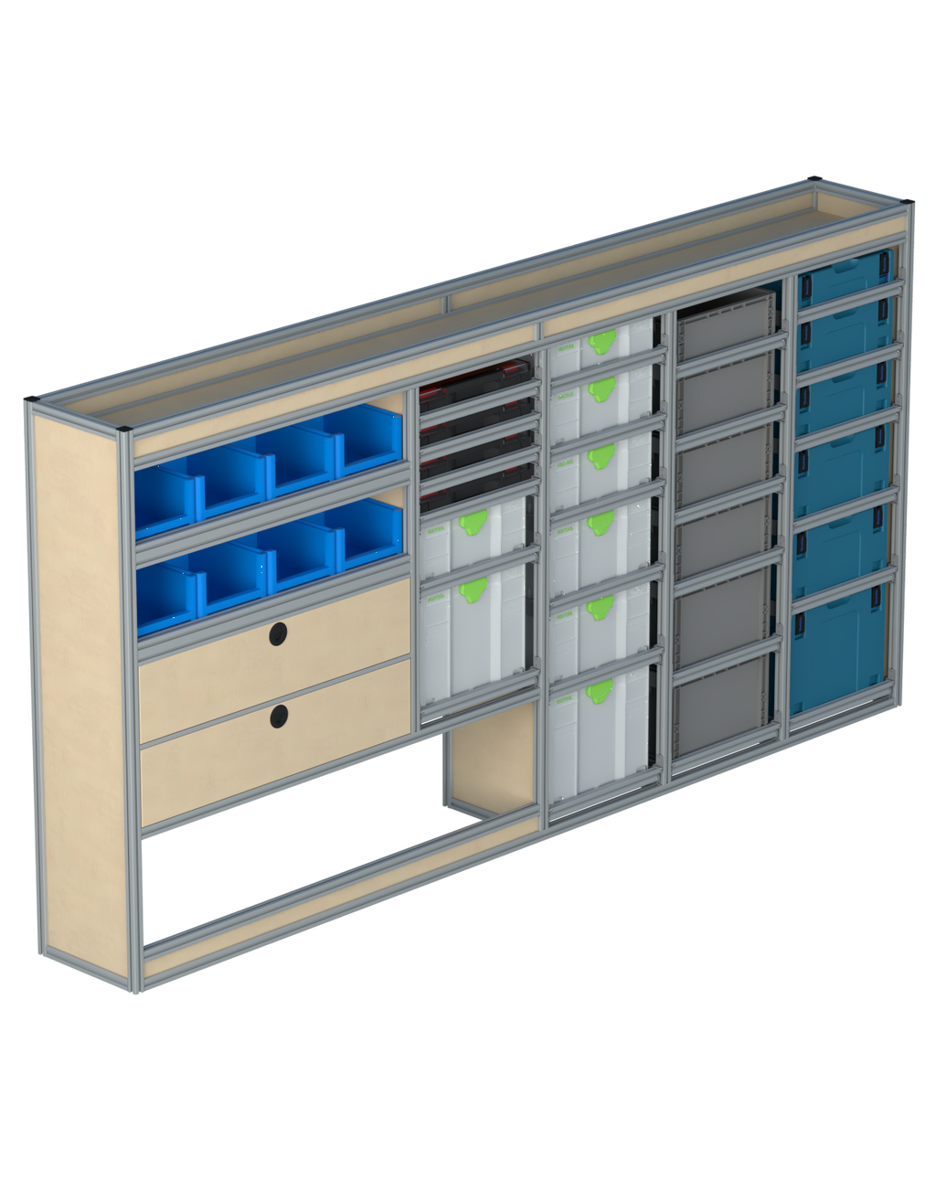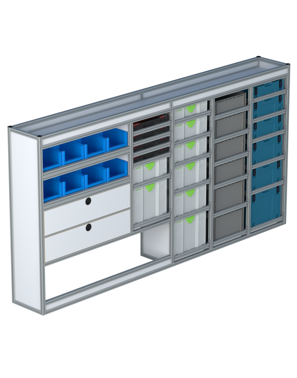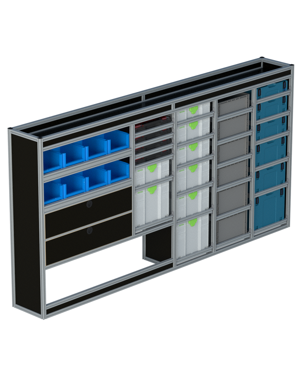 Alle lades zijn volledig traploos in hoogte verstelbaar en zijn later makkelijk weg te halen of bij te plaatsen. De lades zijn standaard voorzien van een goed doordachte ladevergrendeling om het open schuiven tijdens het rijden te voorkomen met een hoog gebruiksgemak.