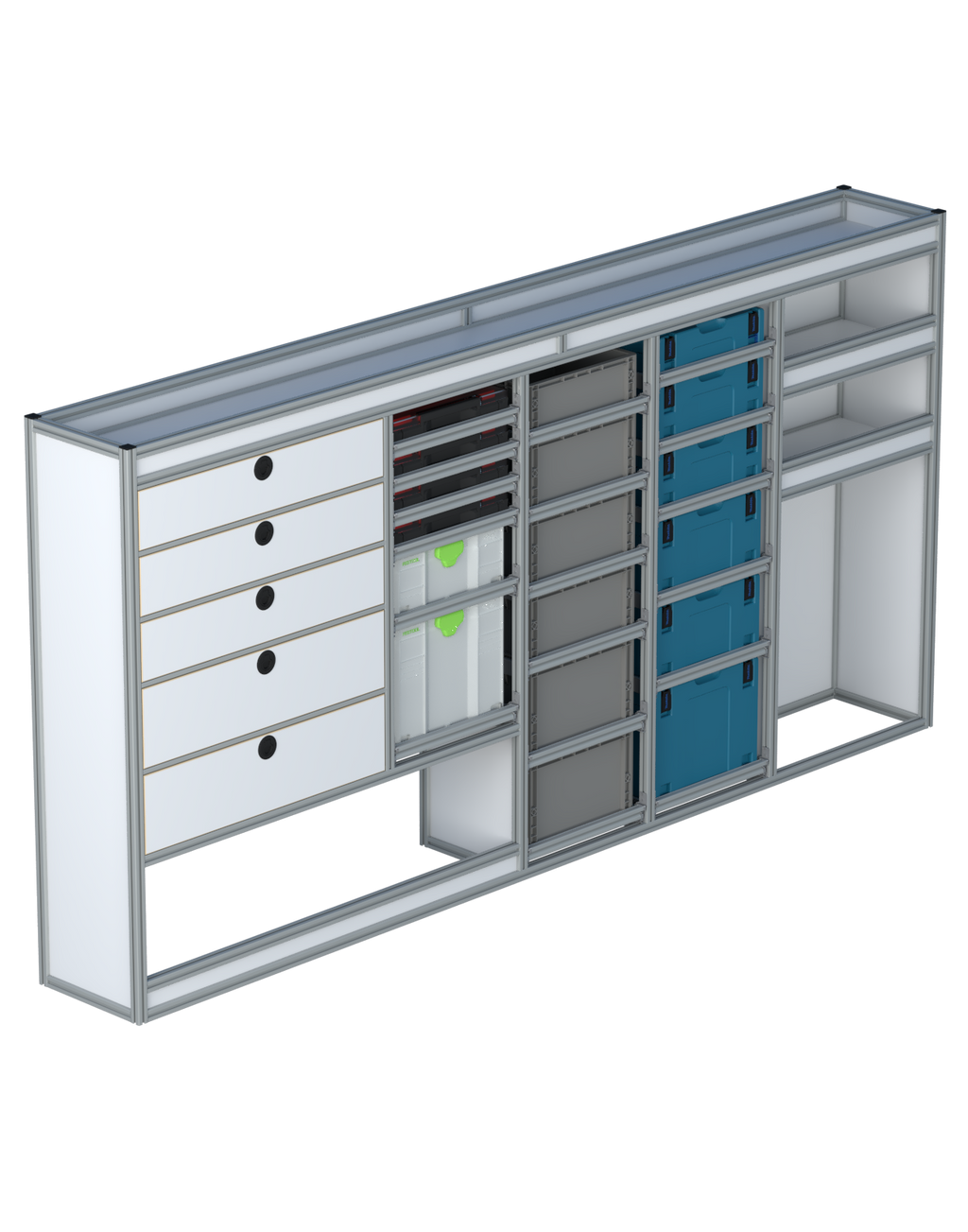 Alle lades zijn volledig traploos in hoogte verstelbaar en zijn later makkelijk weg te halen of bij te plaatsen. De lades zijn standaard voorzien van een goed doordachte ladevergrendeling om het open schuiven tijdens het rijden te voorkomen met een hoog gebruiksgemak.