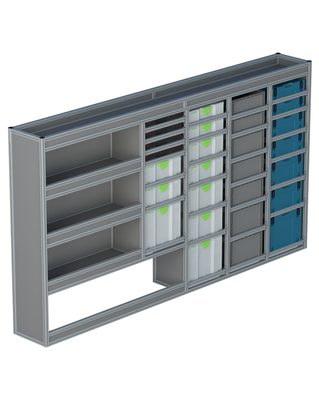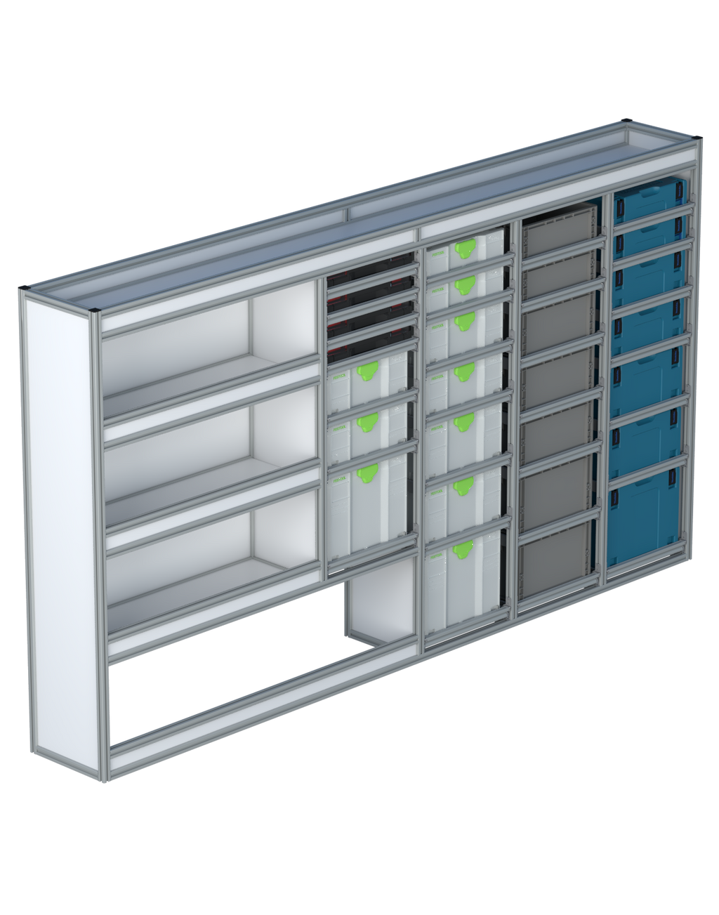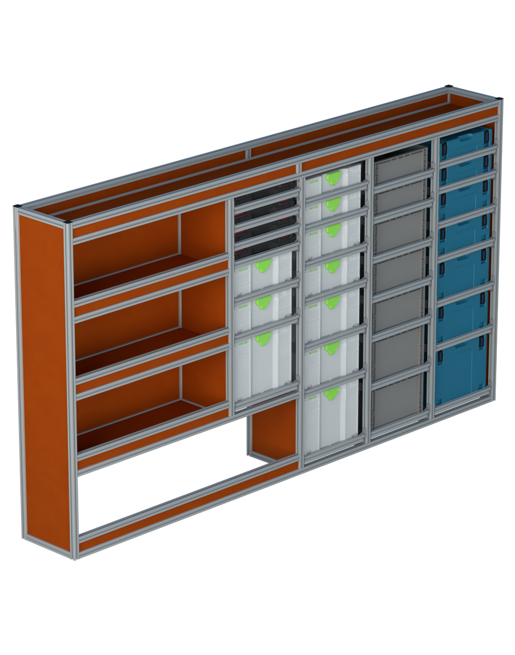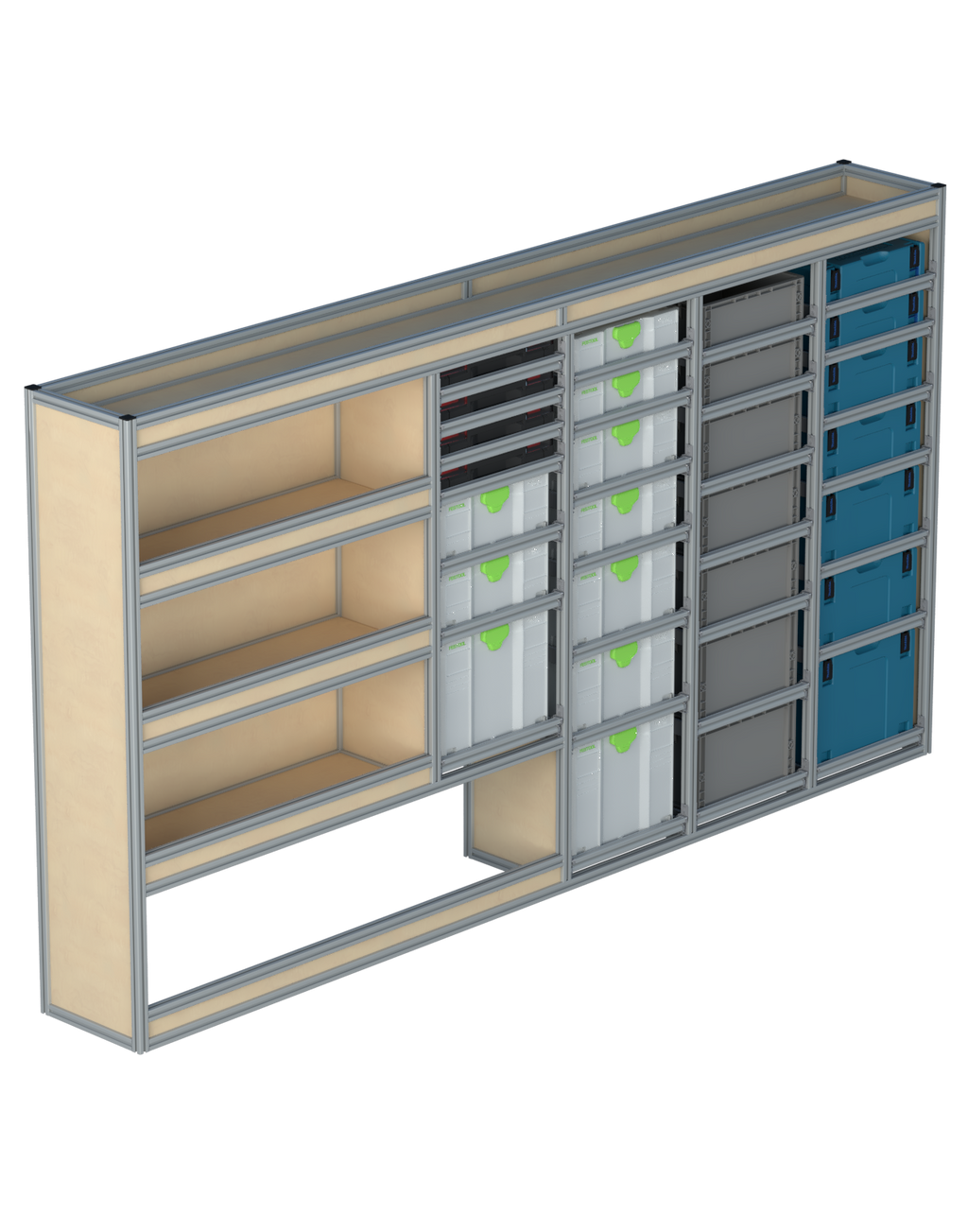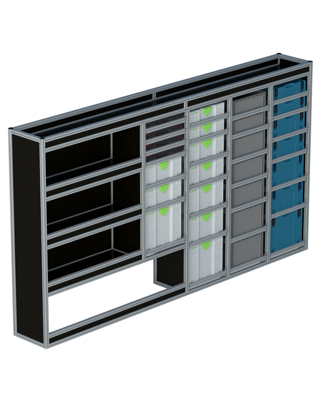 Alle lades zijn volledig traploos in hoogte verstelbaar en zijn later makkelijk weg te halen of bij te plaatsen. De lades zijn standaard voorzien van een goed doordachte ladevergrendeling om het open schuiven tijdens het rijden te voorkomen met een hoog gebruiksgemak.