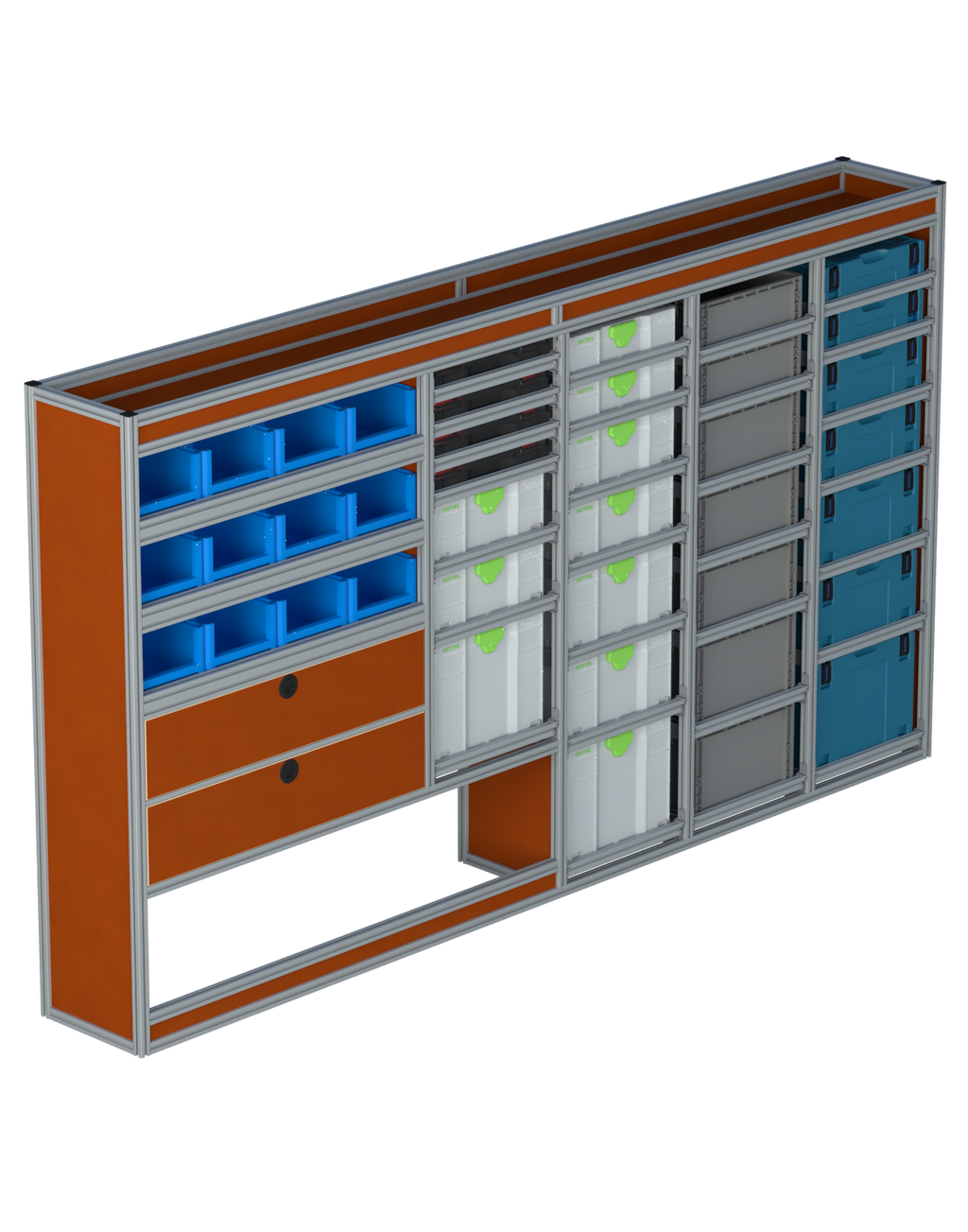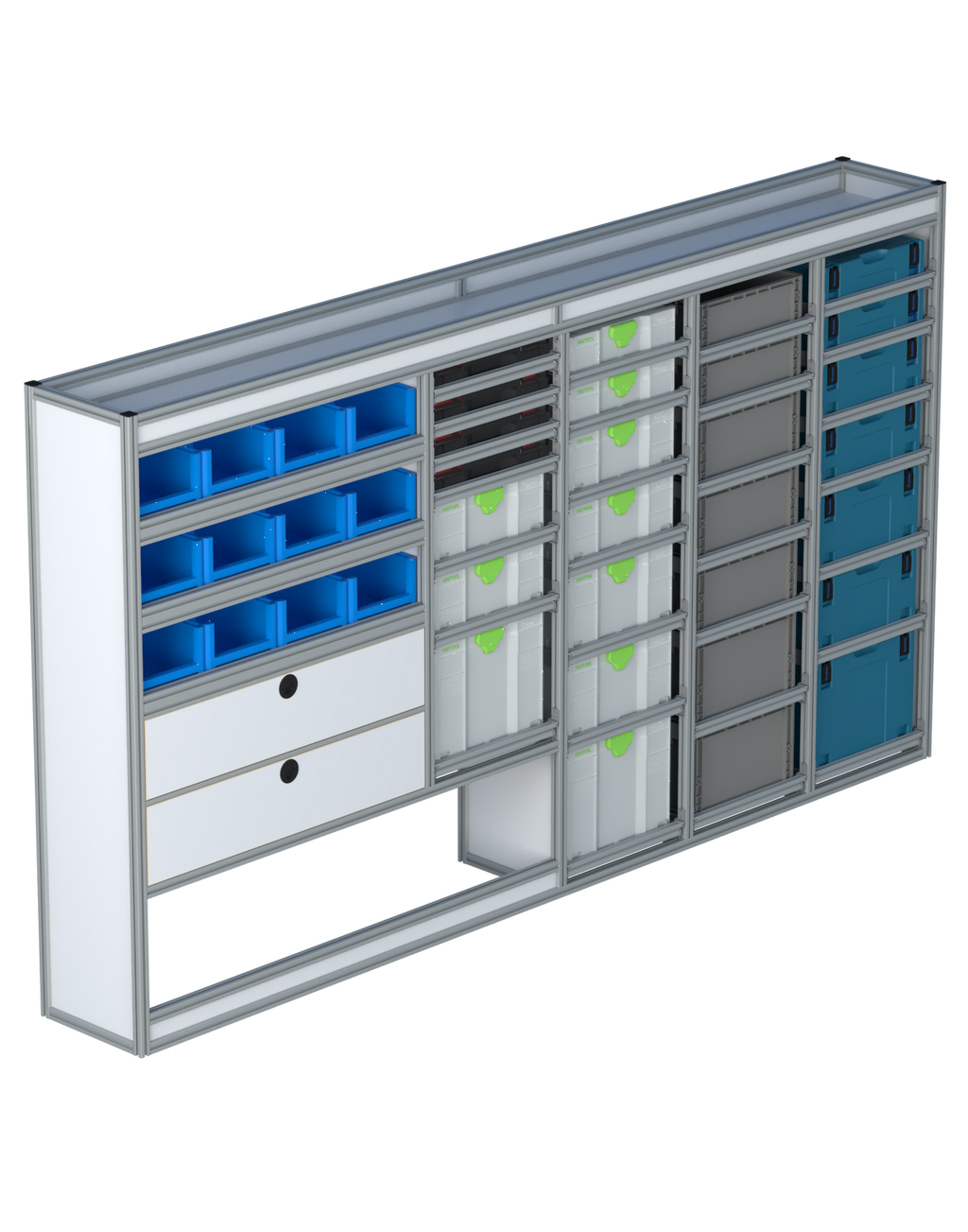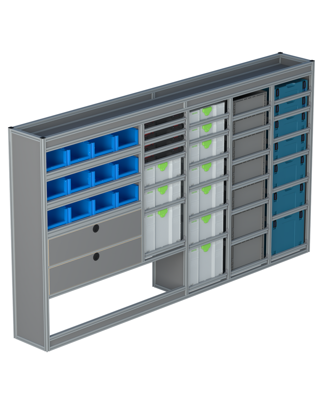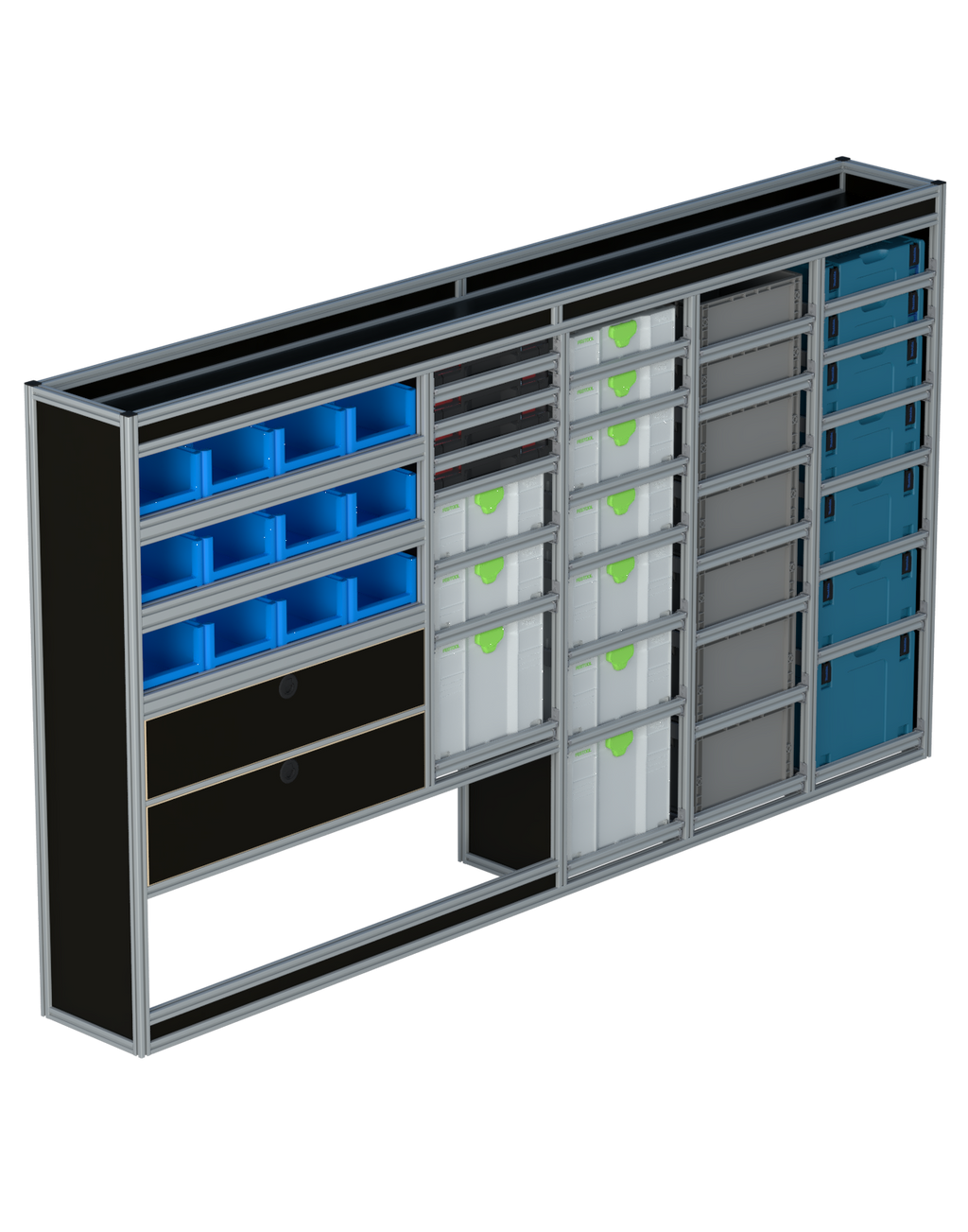 Alle lades zijn volledig traploos in hoogte verstelbaar en zijn later makkelijk weg te halen of bij te plaatsen. De lades zijn standaard voorzien van een goed doordachte ladevergrendeling om het open schuiven tijdens het rijden te voorkomen met een hoog gebruiksgemak.