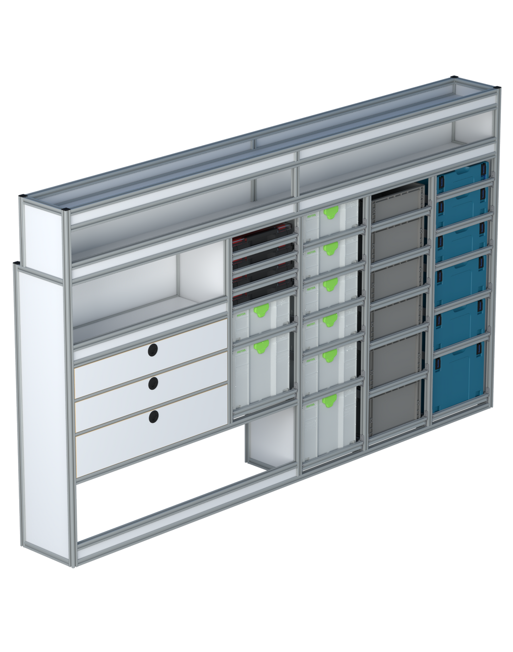 Alle lades zijn volledig traploos in hoogte verstelbaar en zijn later makkelijk weg te halen of bij te plaatsen. De lades zijn standaard voorzien van een goed doordachte ladevergrendeling om het open schuiven tijdens het rijden te voorkomen met een hoog gebruiksgemak.