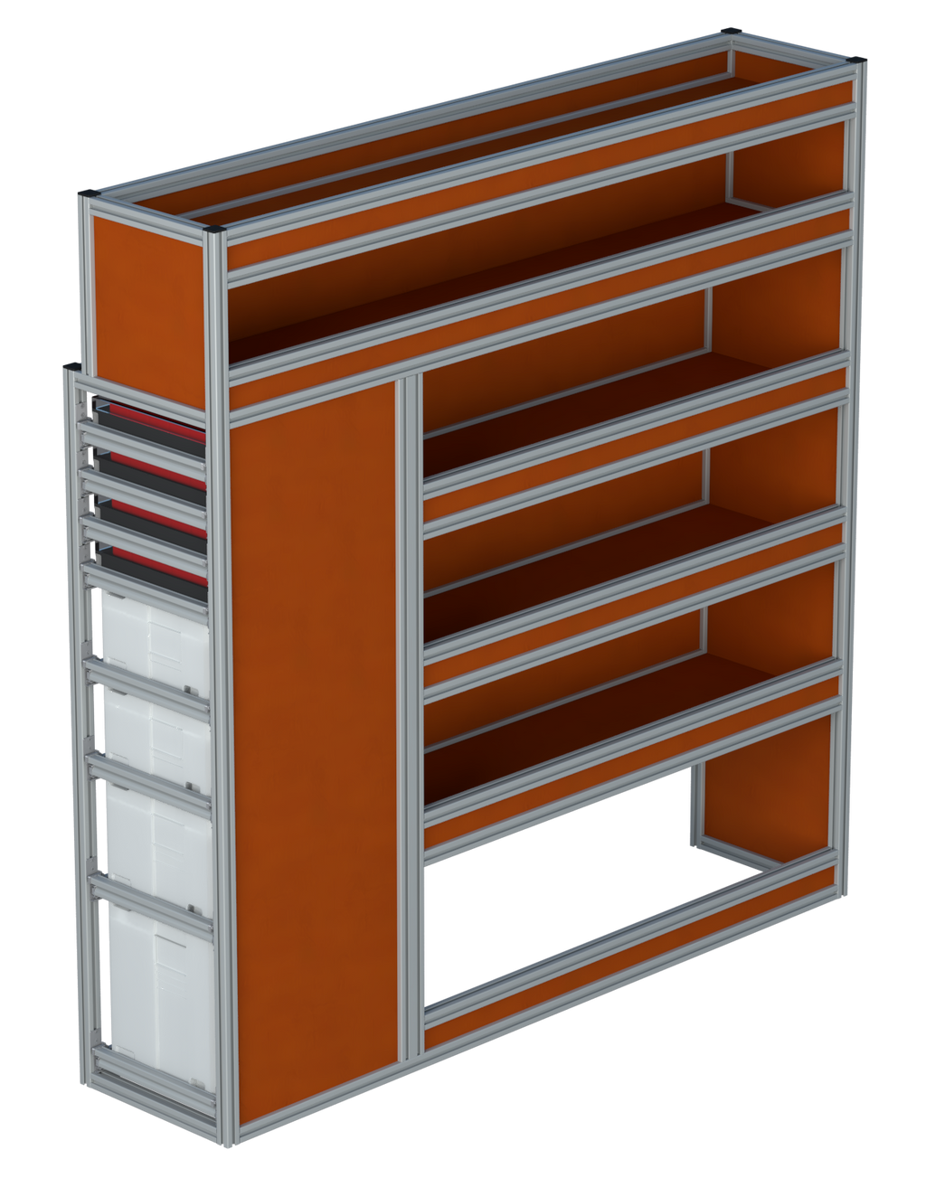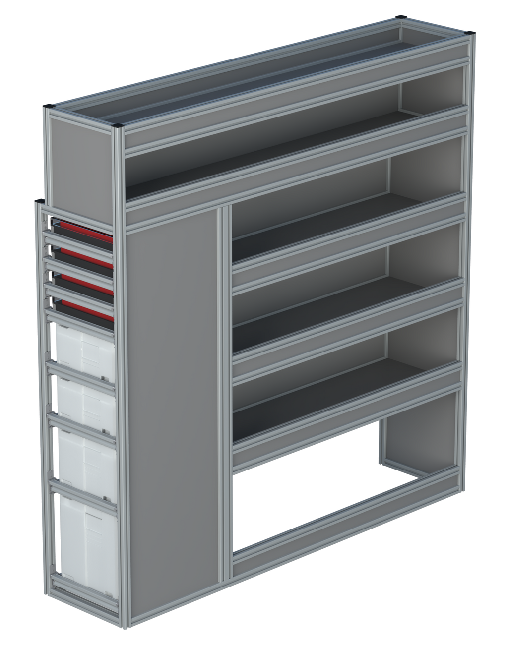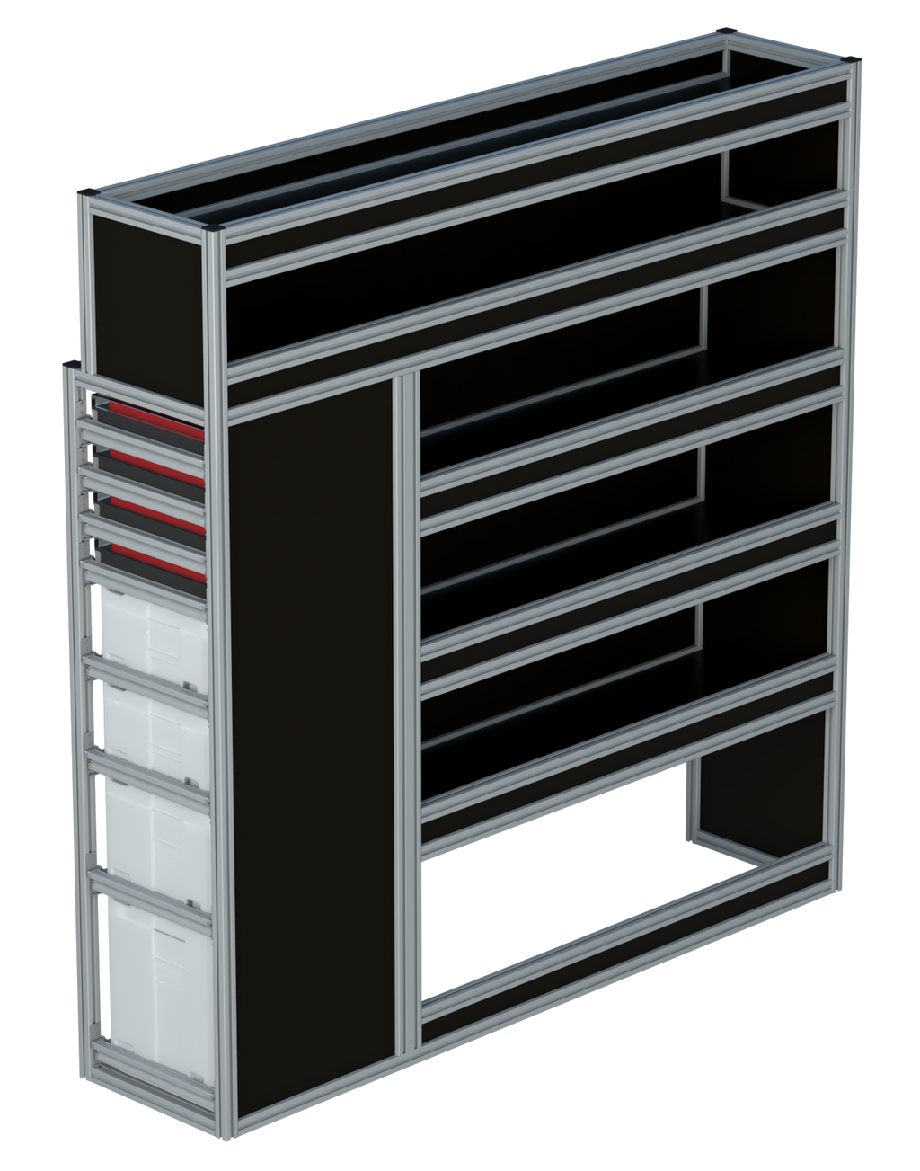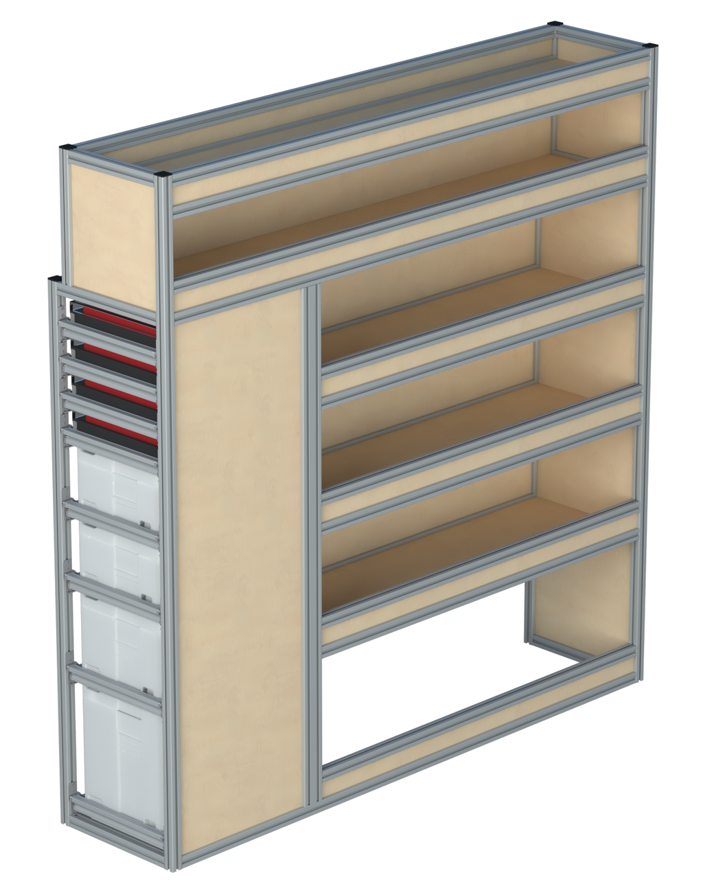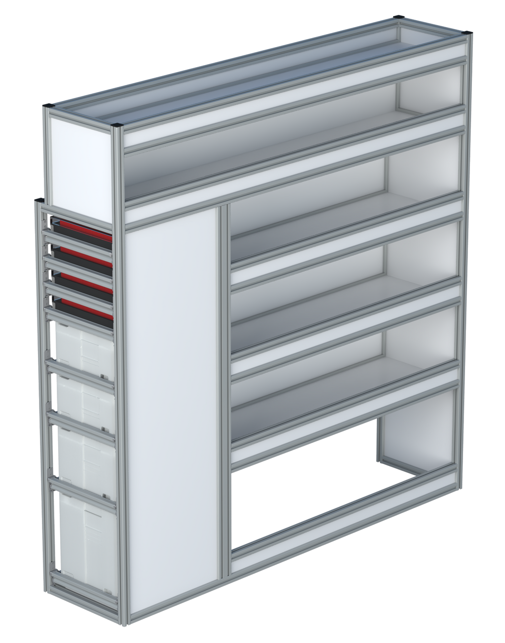 Alle lades zijn volledig traploos in hoogte verstelbaar en zijn later makkelijk weg te halen of bij te plaatsen. De lades zijn standaard voorzien van een goed doordachte ladevergrendeling om het open schuiven tijdens het rijden te voorkomen met een hoog gebruiksgemak.