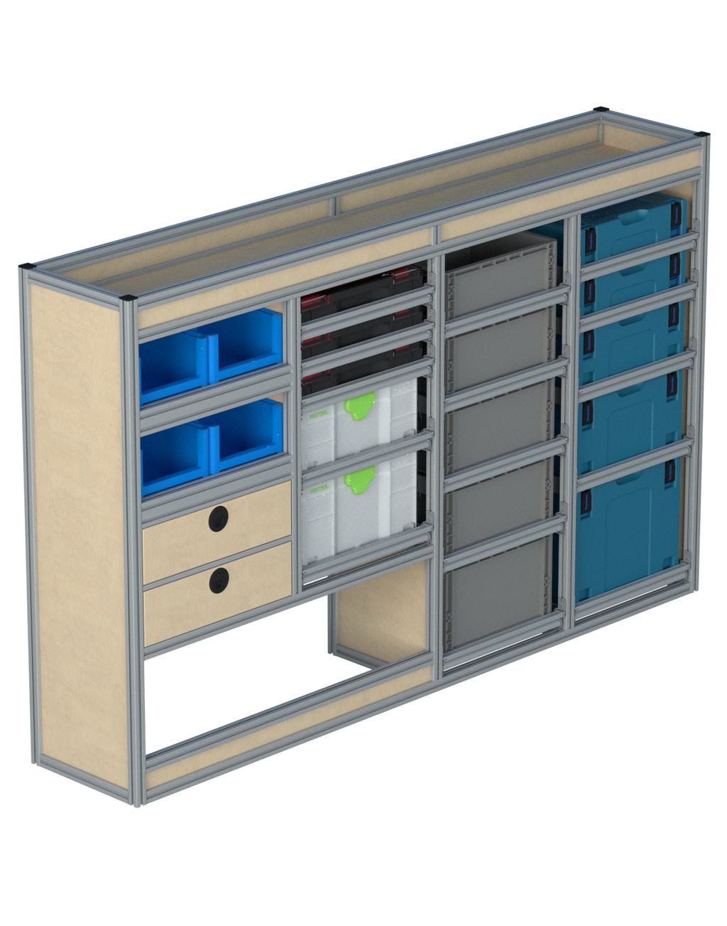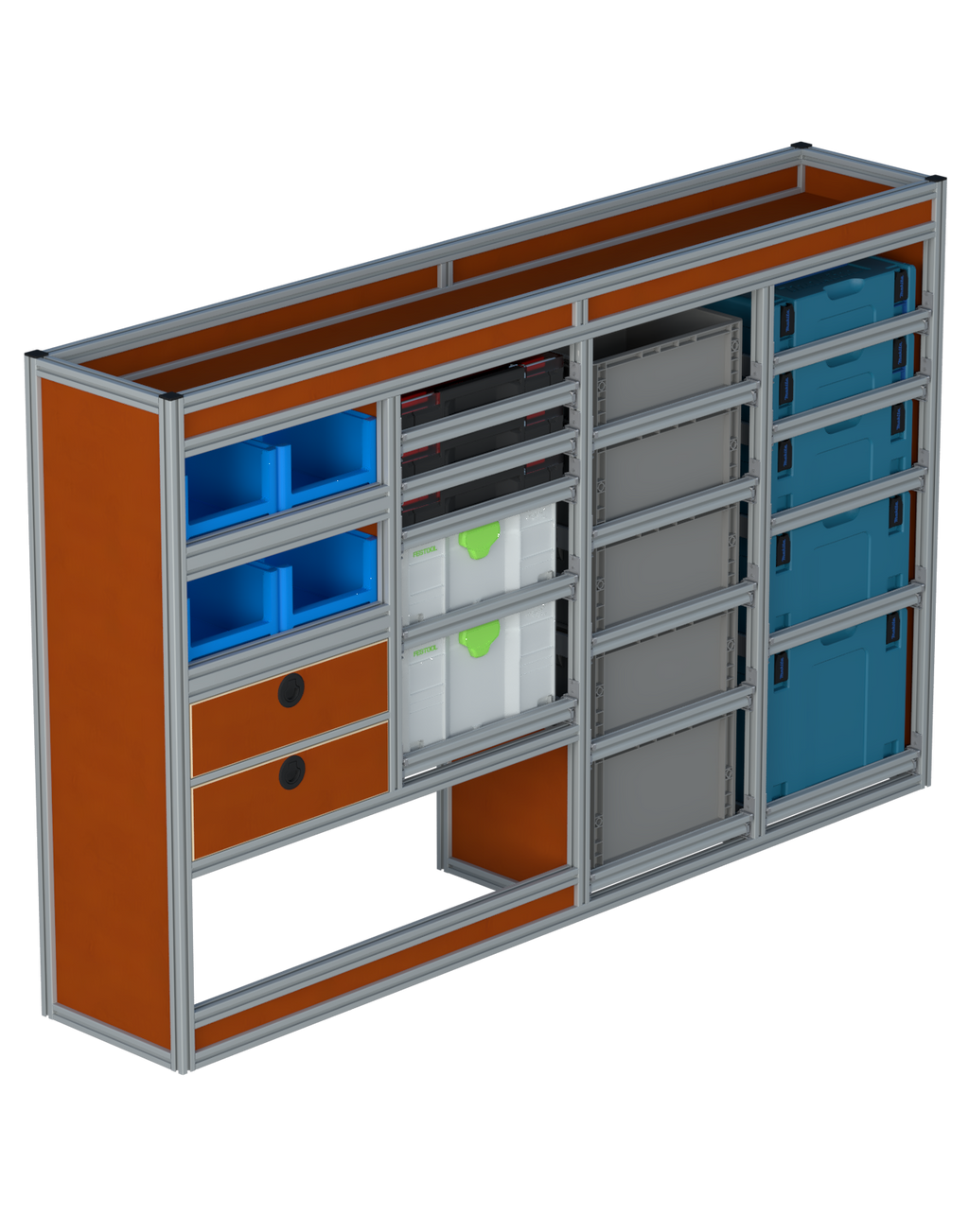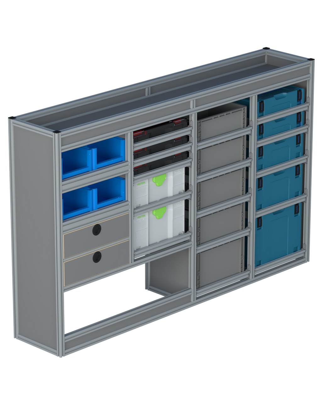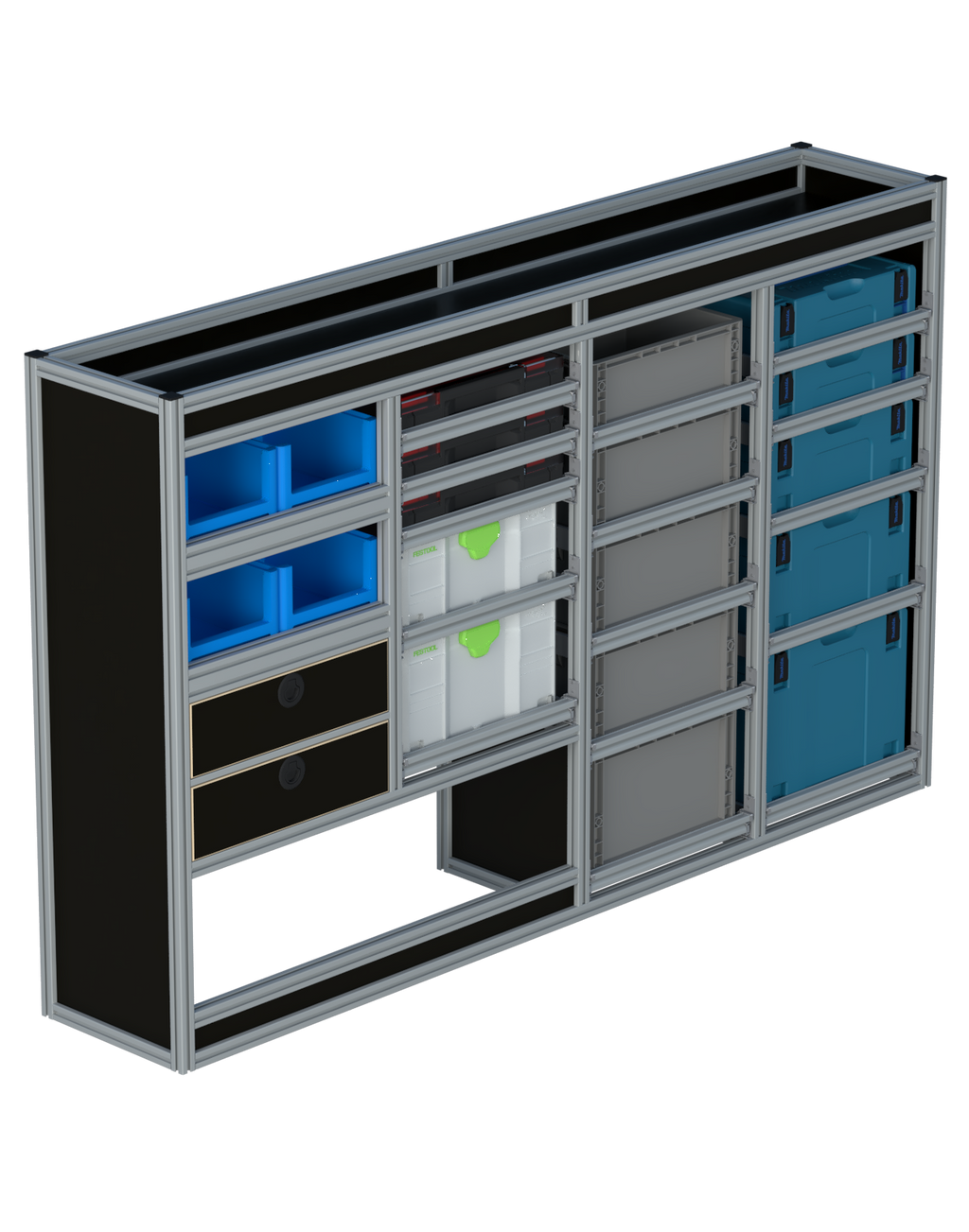 Alle lades zijn volledig traploos in hoogte verstelbaar en zijn later makkelijk weg te halen of bij te plaatsen. De lades zijn standaard voorzien van een goed doordachte ladevergrendeling om het open schuiven tijdens het rijden te voorkomen met een hoog gebruiksgemak.