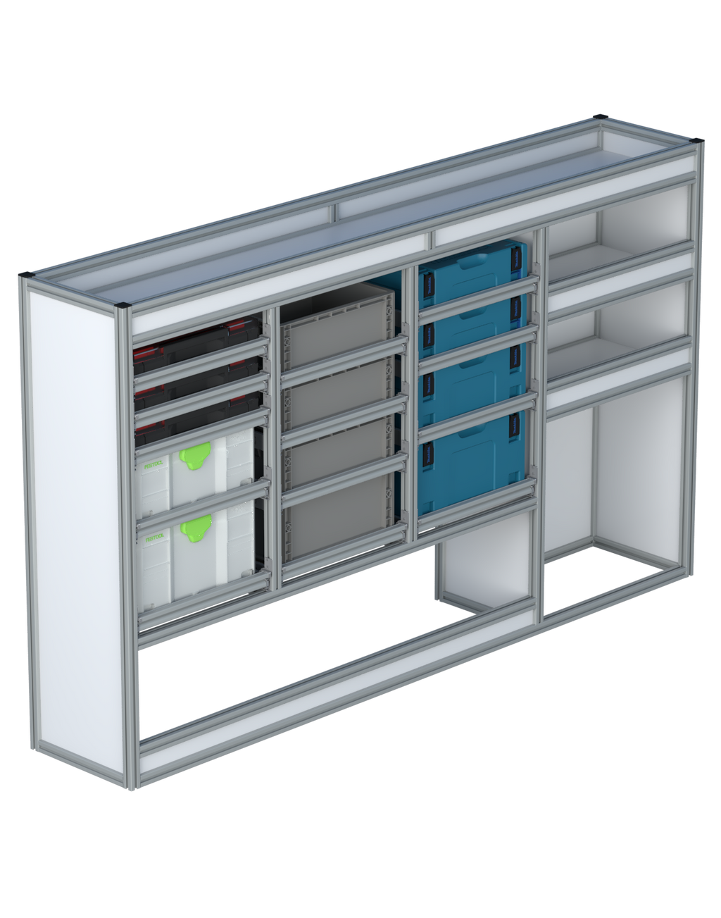 Alle lades zijn volledig traploos in hoogte verstelbaar en zijn later makkelijk weg te halen of bij te plaatsen. De lades zijn standaard voorzien van een goed doordachte ladevergrendeling om het open schuiven tijdens het rijden te voorkomen met een hoog gebruiksgemak.