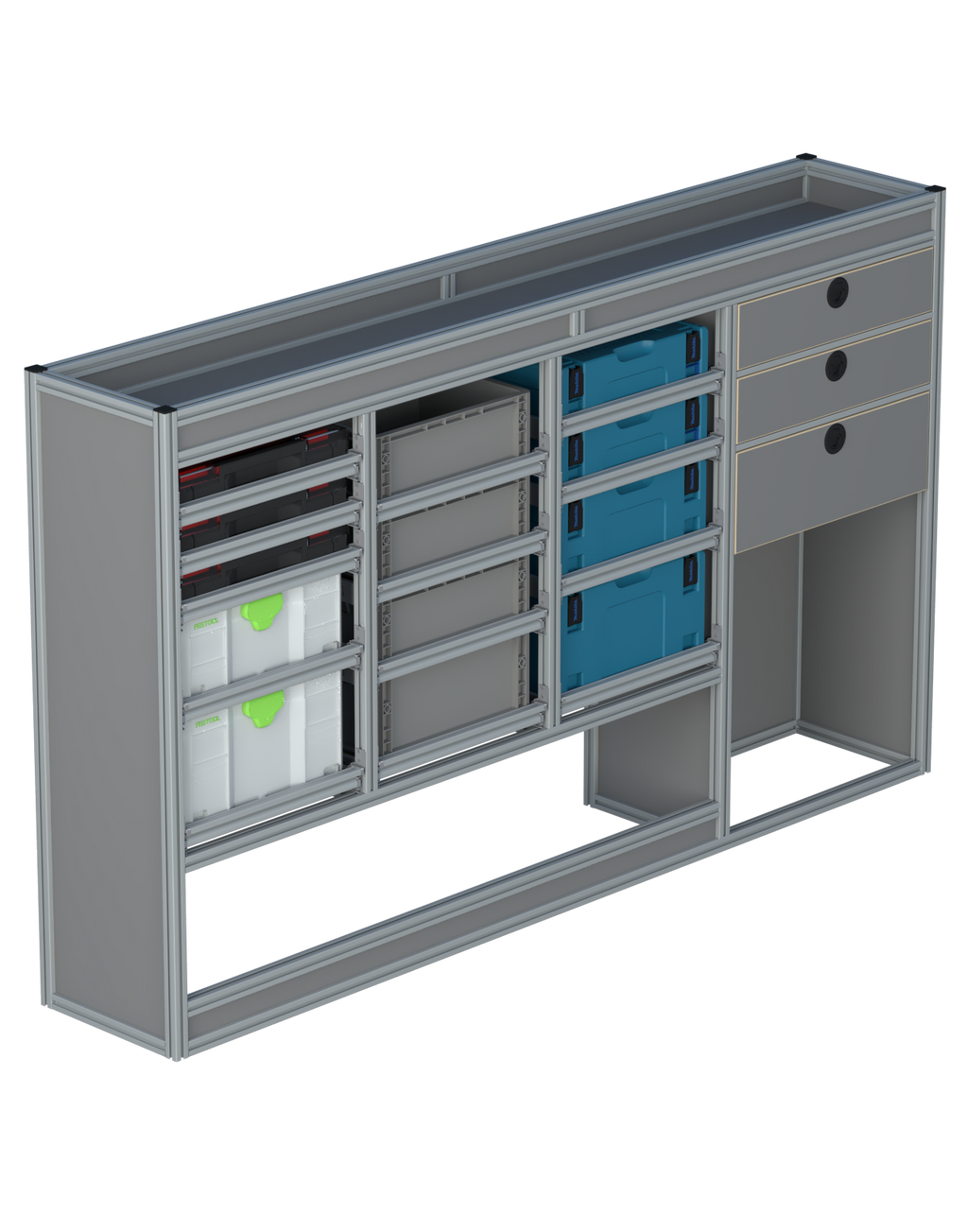 Alle lades zijn volledig traploos in hoogte verstelbaar en zijn later makkelijk weg te halen of bij te plaatsen. De lades zijn standaard voorzien van een goed doordachte ladevergrendeling om het open schuiven tijdens het rijden te voorkomen met een hoog gebruiksgemak.