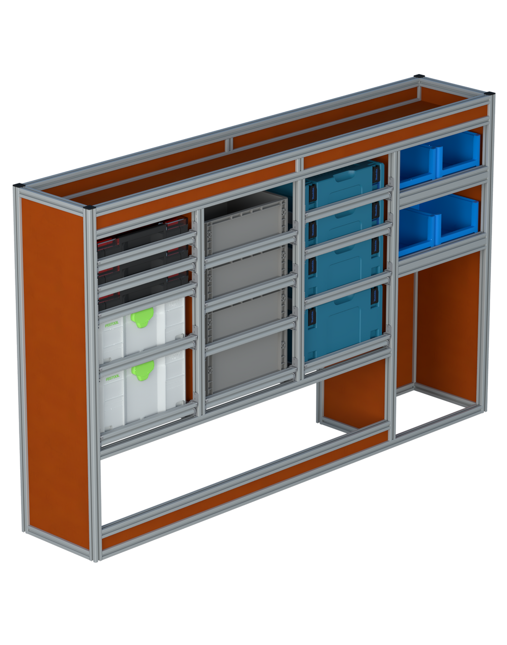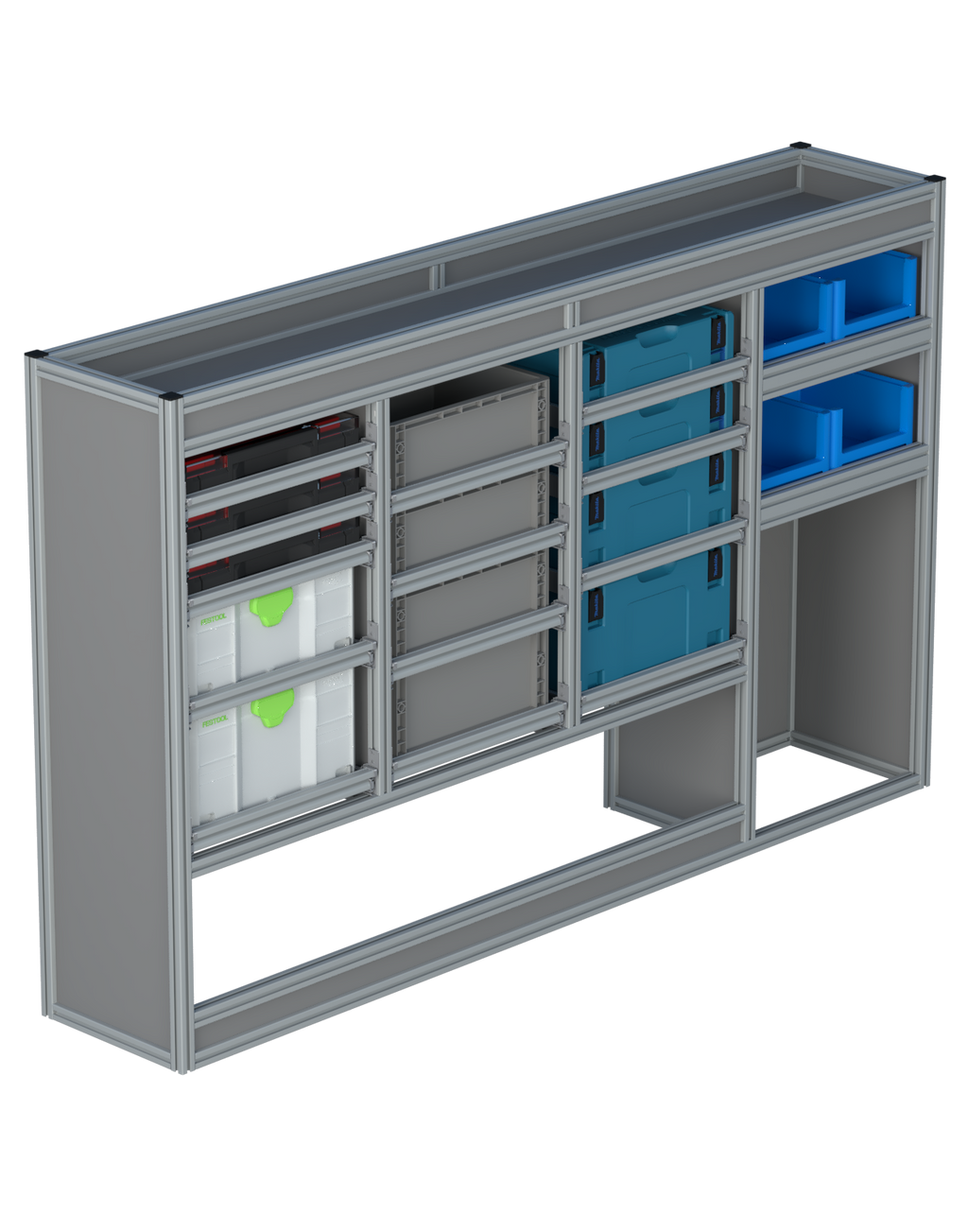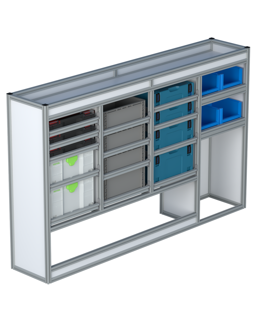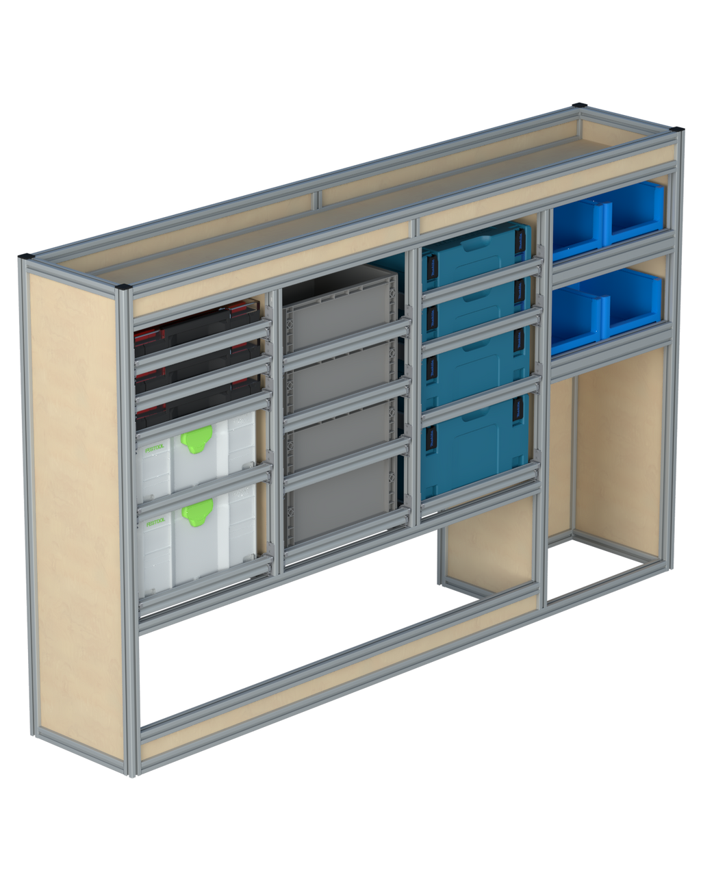 Alle lades zijn volledig traploos in hoogte verstelbaar en zijn later makkelijk weg te halen of bij te plaatsen. De lades zijn standaard voorzien van een goed doordachte ladevergrendeling om het open schuiven tijdens het rijden te voorkomen met een hoog gebruiksgemak.