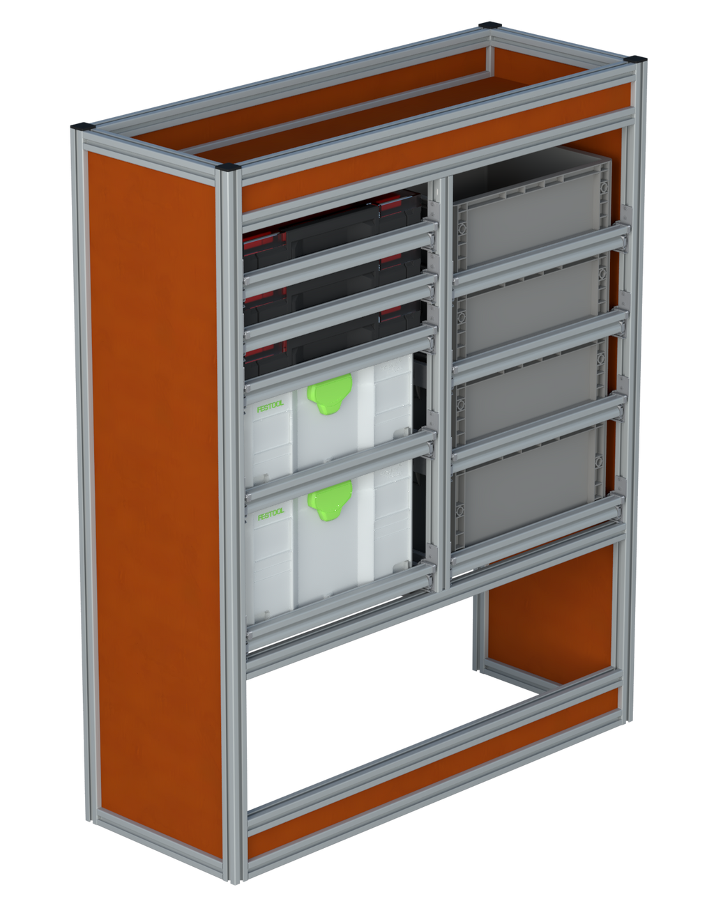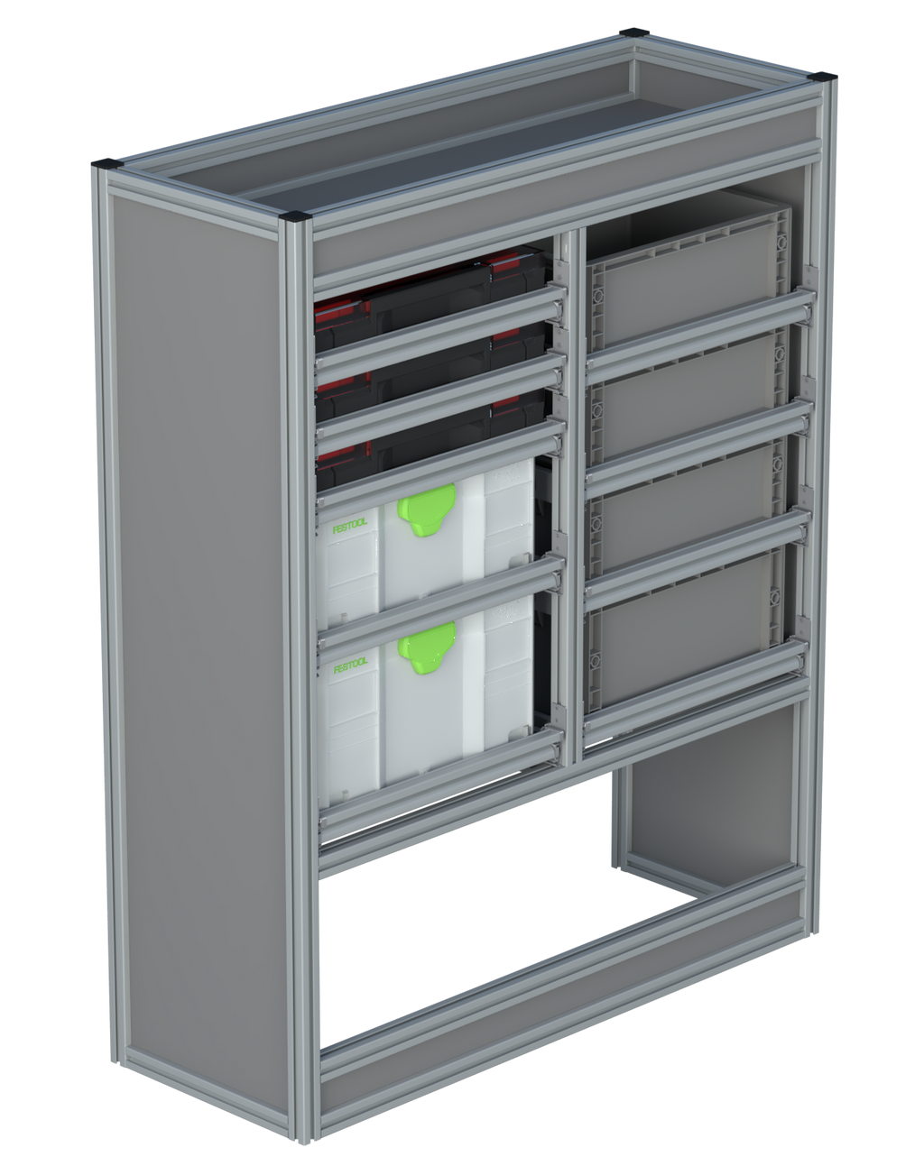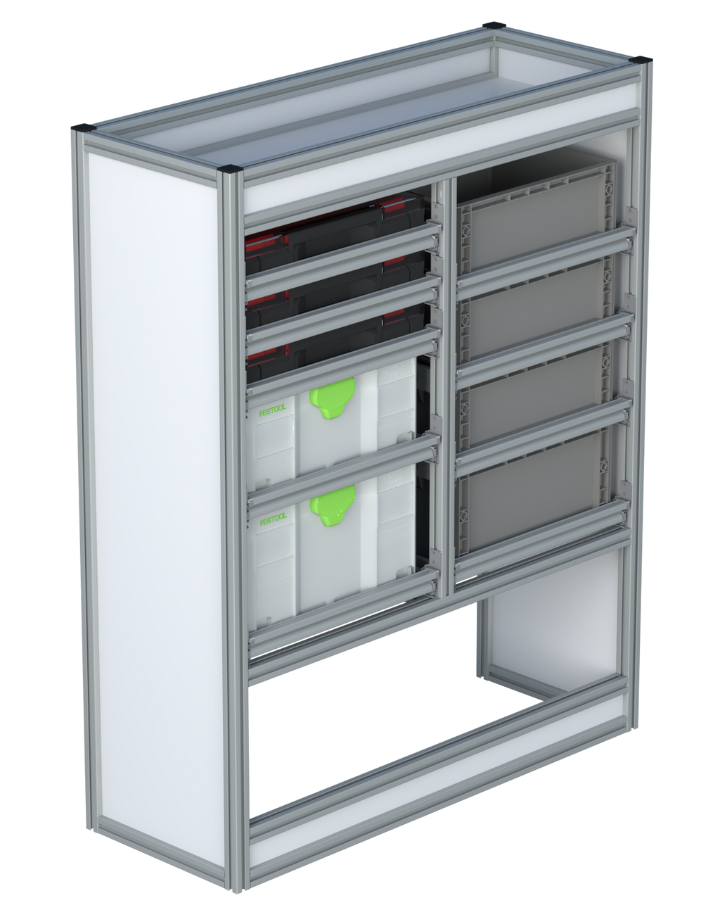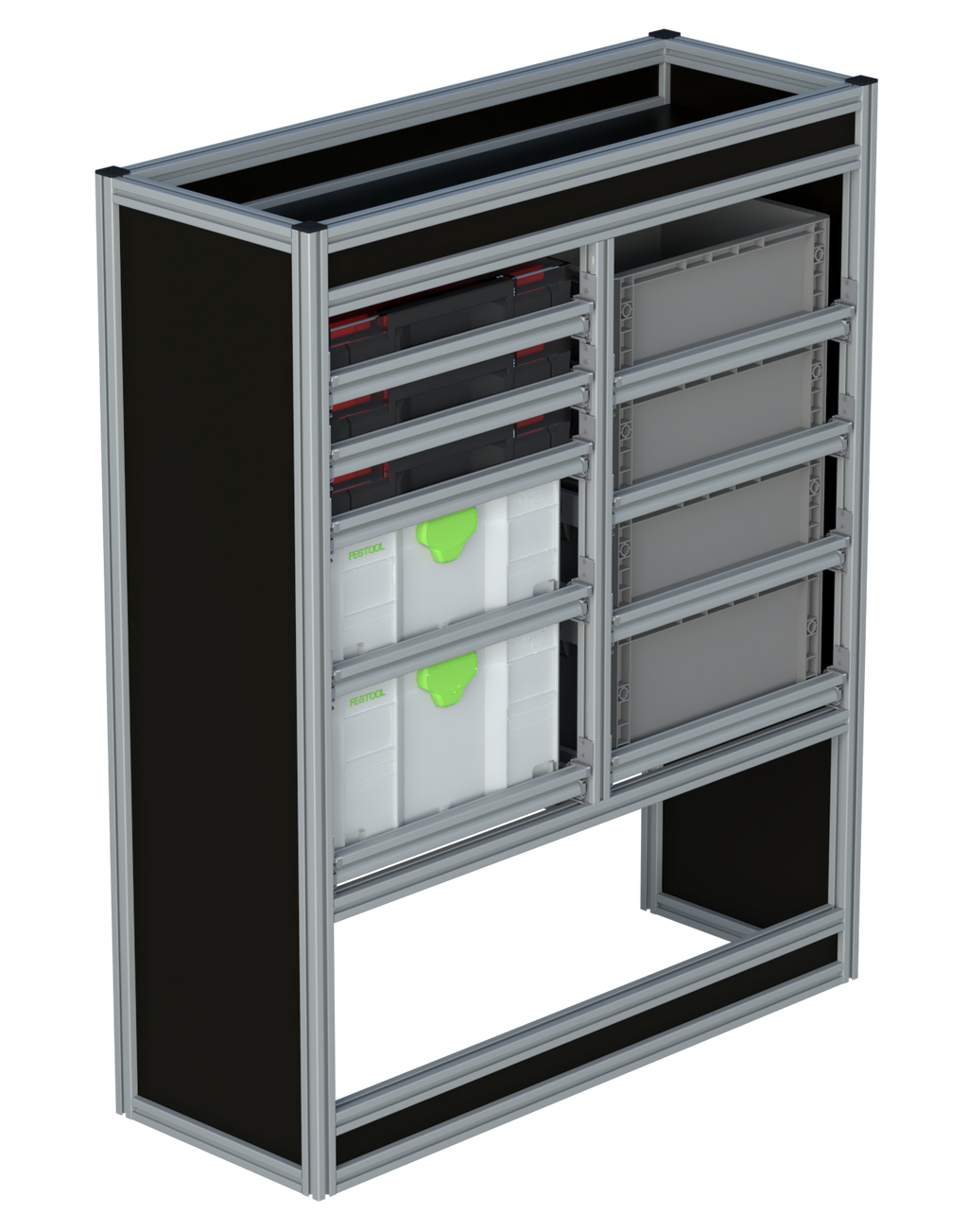 Alle lades zijn volledig traploos in hoogte verstelbaar en zijn later makkelijk weg te halen of bij te plaatsen. De lades zijn standaard voorzien van een goed doordachte ladevergrendeling om het open schuiven tijdens het rijden te voorkomen met een hoog gebruiksgemak.