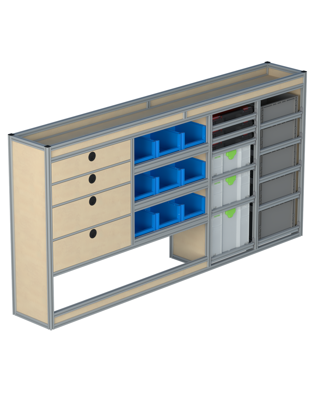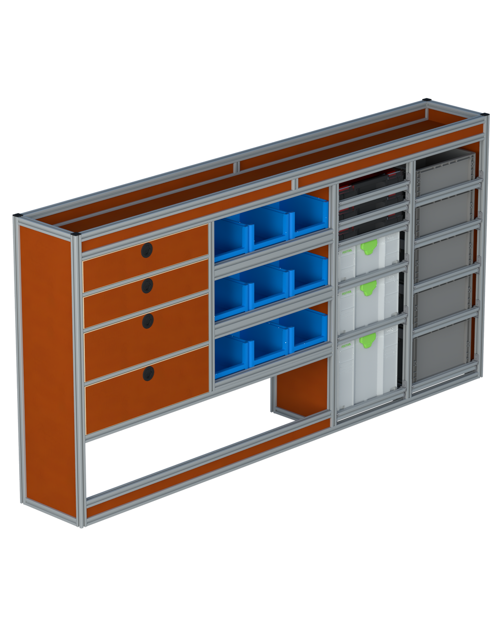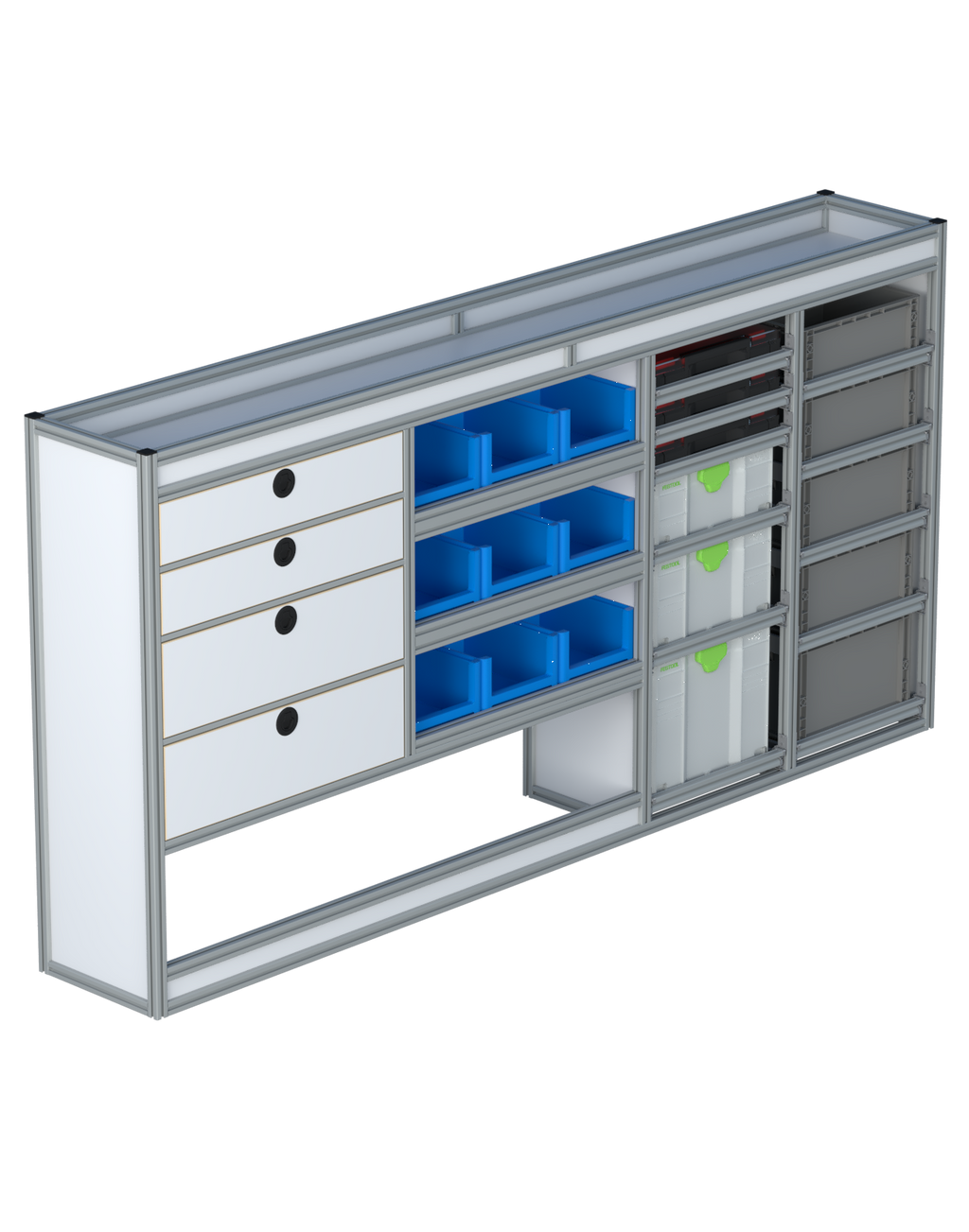 Alle lades zijn volledig traploos in hoogte verstelbaar en zijn later makkelijk weg te halen of bij te plaatsen. De lades zijn standaard voorzien van een goed doordachte ladevergrendeling om het open schuiven tijdens het rijden te voorkomen met een hoog gebruiksgemak.