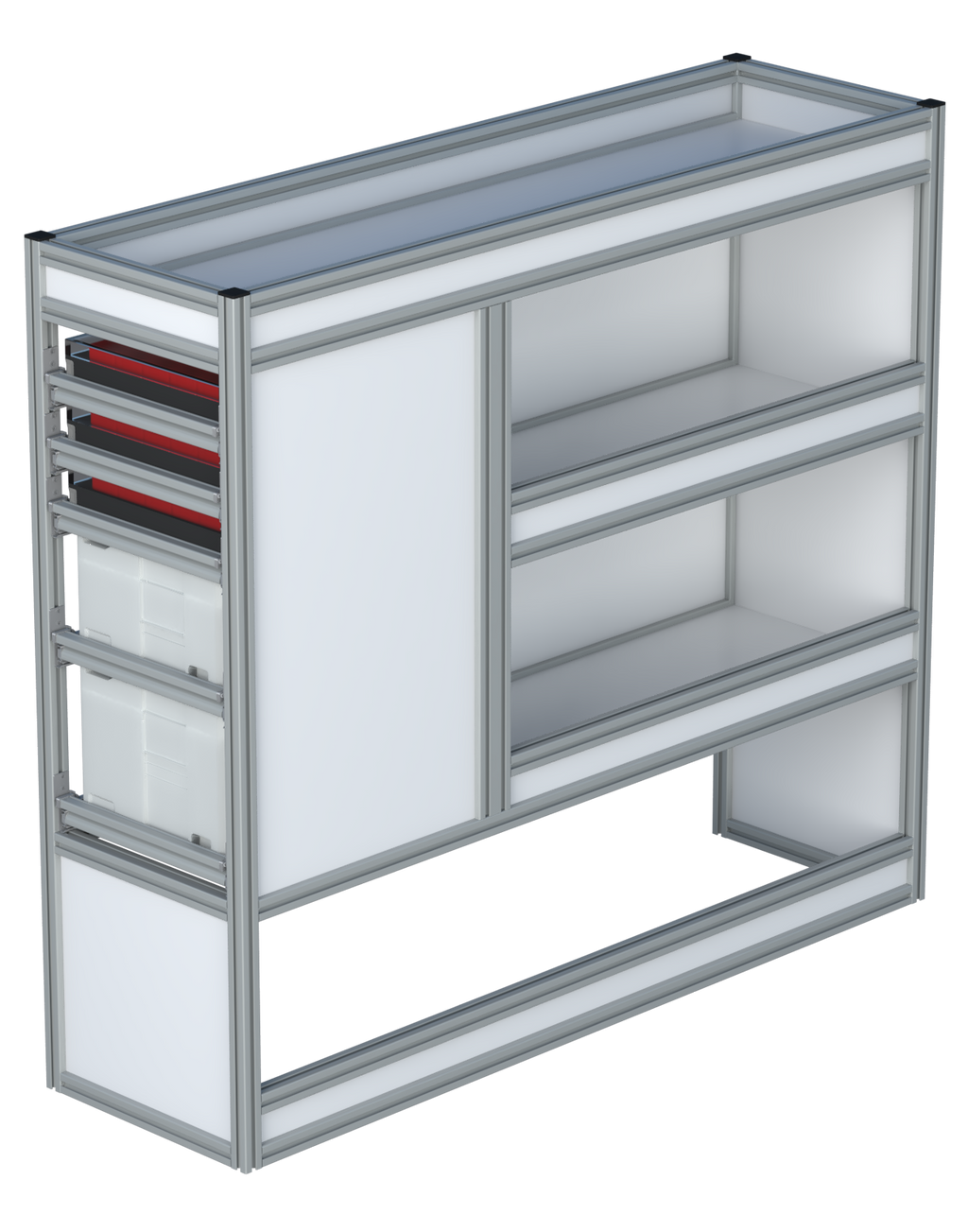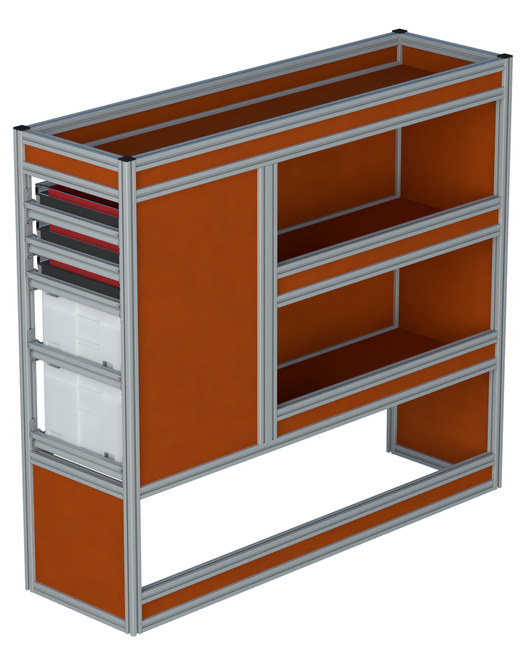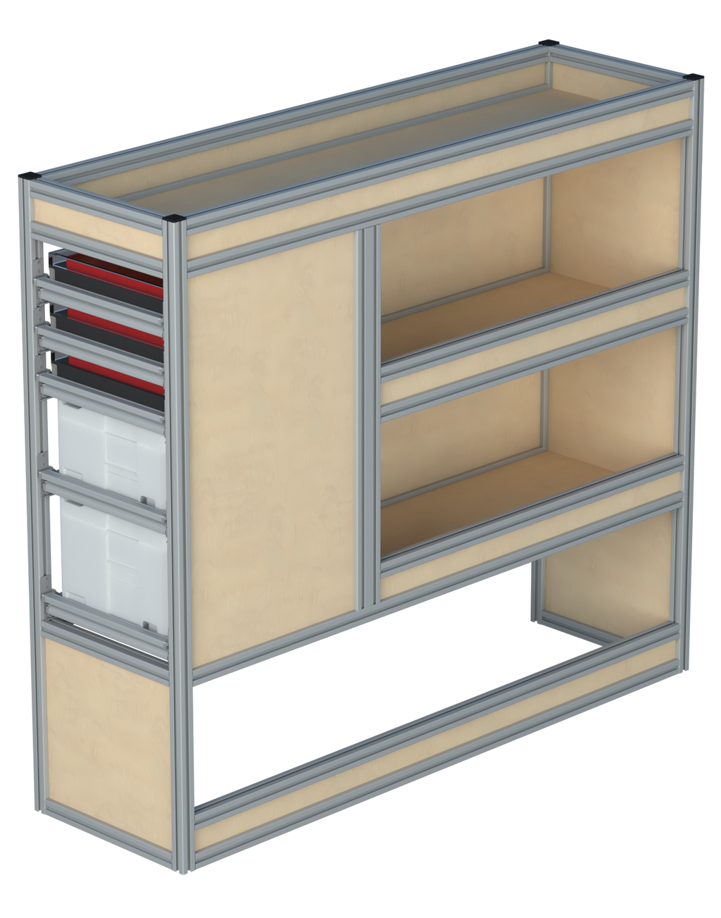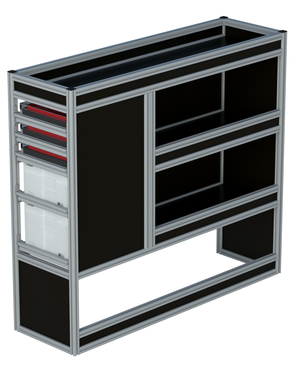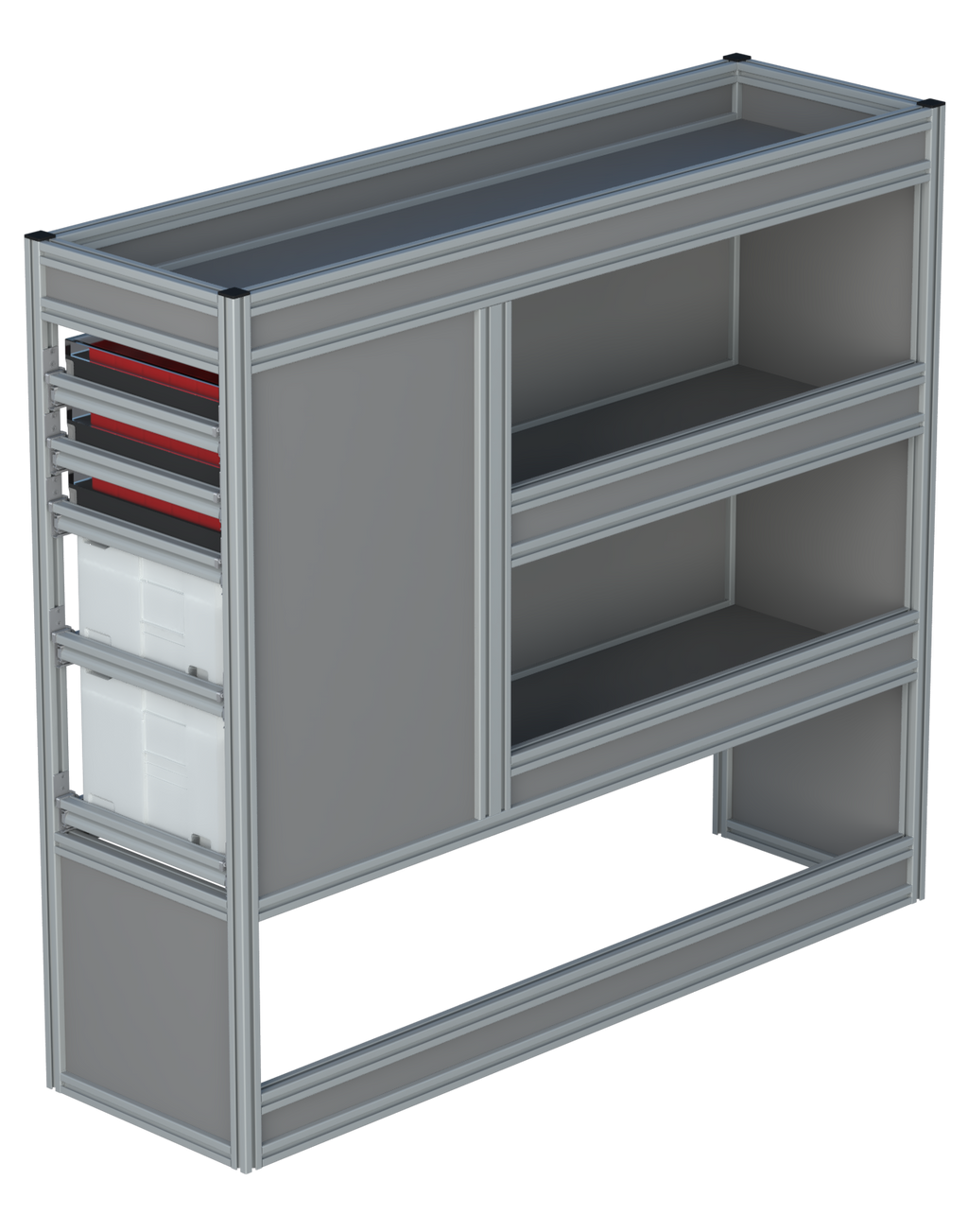 Alle lades zijn volledig traploos in hoogte verstelbaar en zijn later makkelijk weg te halen of bij te plaatsen. De lades zijn standaard voorzien van een goed doordachte ladevergrendeling om het open schuiven tijdens het rijden te voorkomen met een hoog gebruiksgemak.