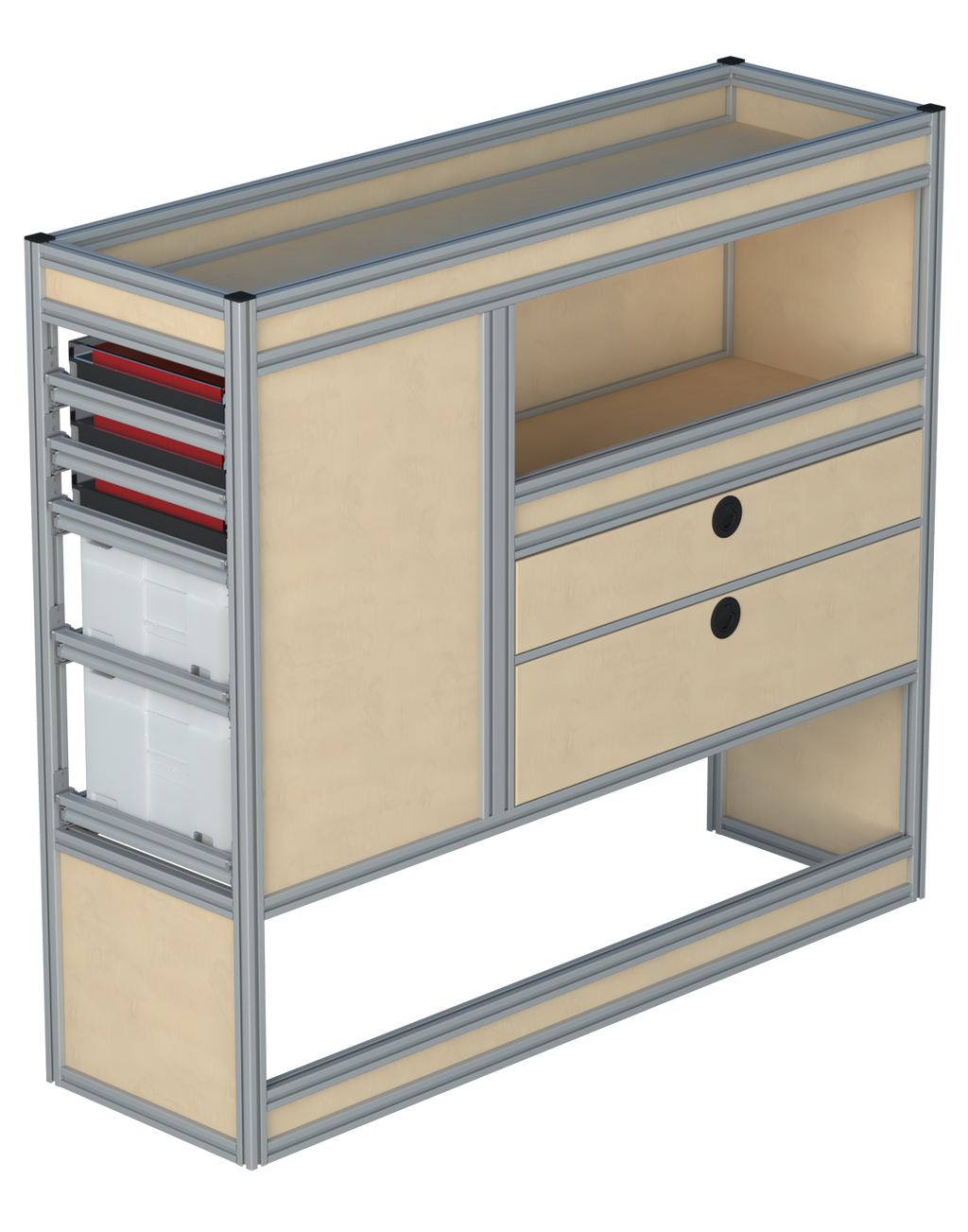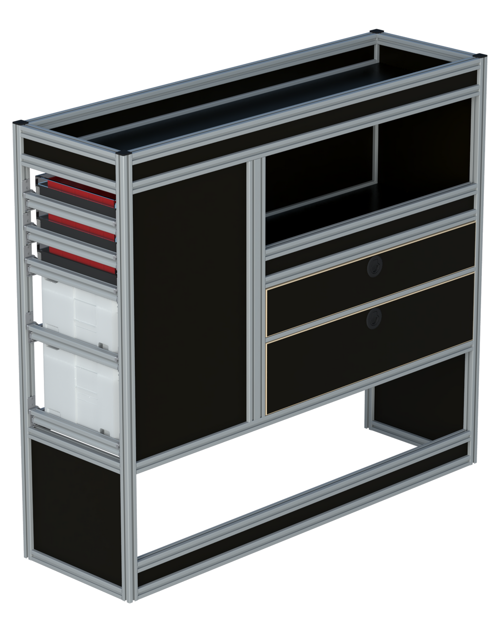 Alle lades zijn volledig traploos in hoogte verstelbaar en zijn later makkelijk weg te halen of bij te plaatsen. De lades zijn standaard voorzien van een goed doordachte ladevergrendeling om het open schuiven tijdens het rijden te voorkomen met een hoog gebruiksgemak.
