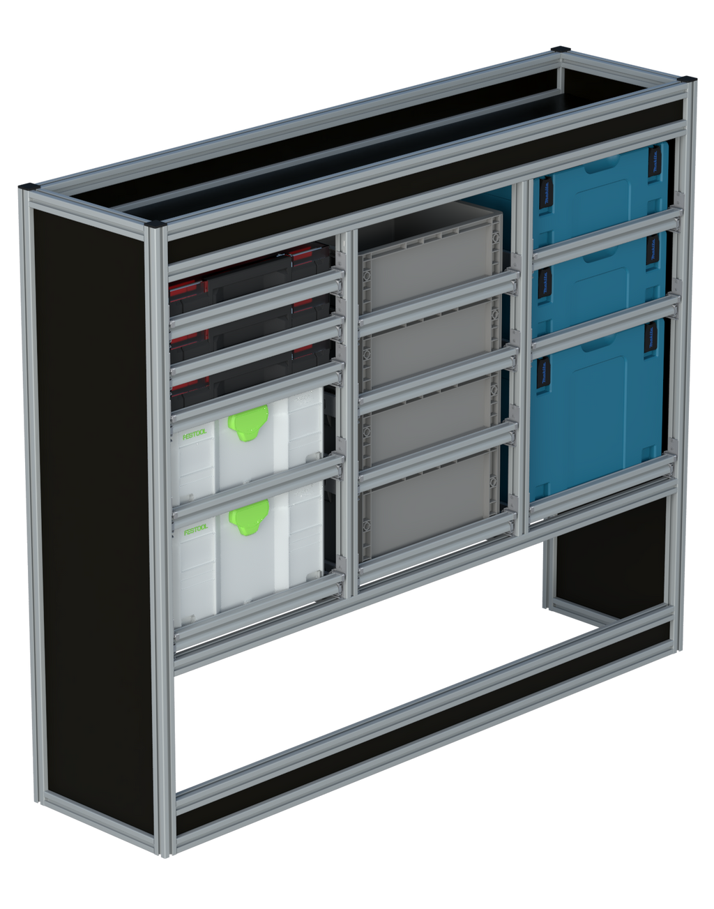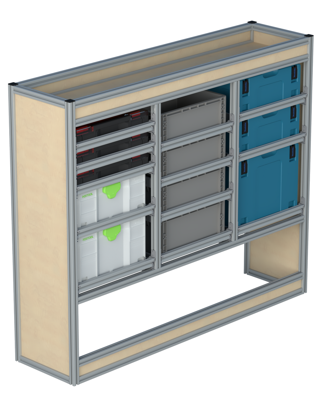 Alle lades zijn volledig traploos in hoogte verstelbaar en zijn later makkelijk weg te halen of bij te plaatsen. De lades zijn standaard voorzien van een goed doordachte ladevergrendeling om het open schuiven tijdens het rijden te voorkomen met een hoog gebruiksgemak.